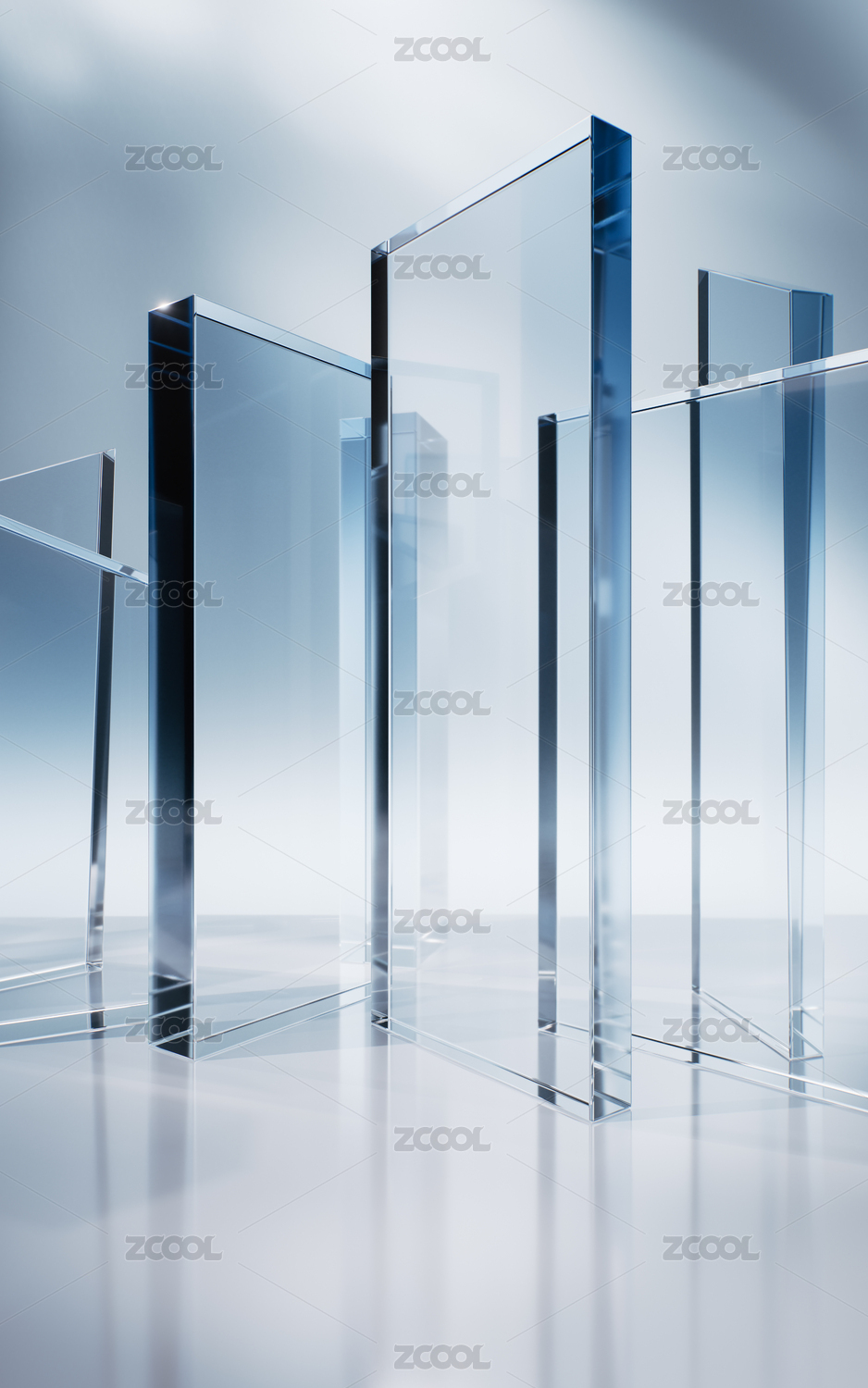 透明蓝色柱状玻璃背景三维渲染