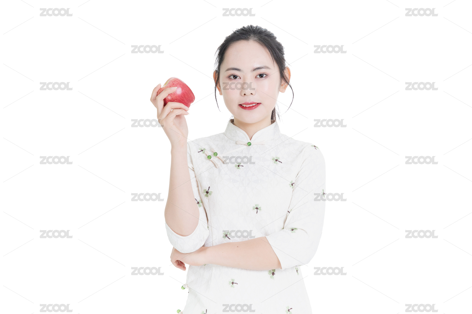白色背景前穿着旗袍吃苹果的美丽女性