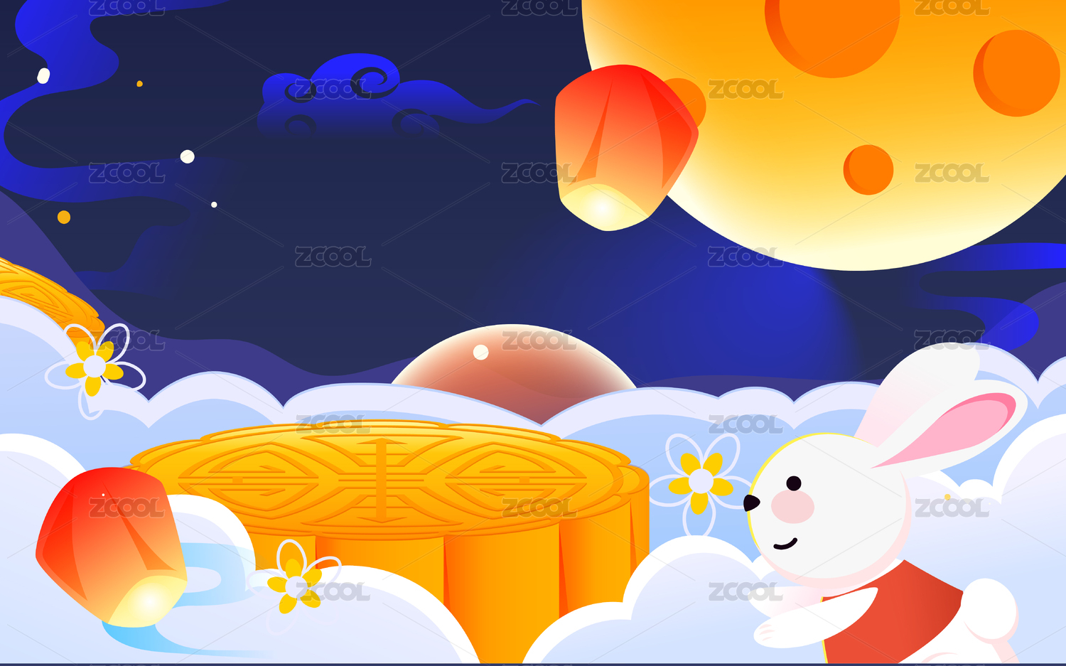 中秋玉兔月圆桂花灯笼下共赏佳节卡通美景