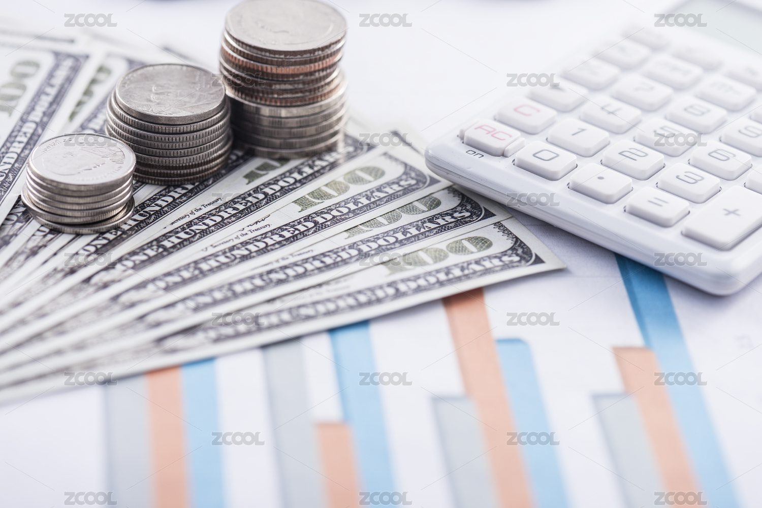 堆叠的硬币与银行卡、信用卡放在铺开的美金上