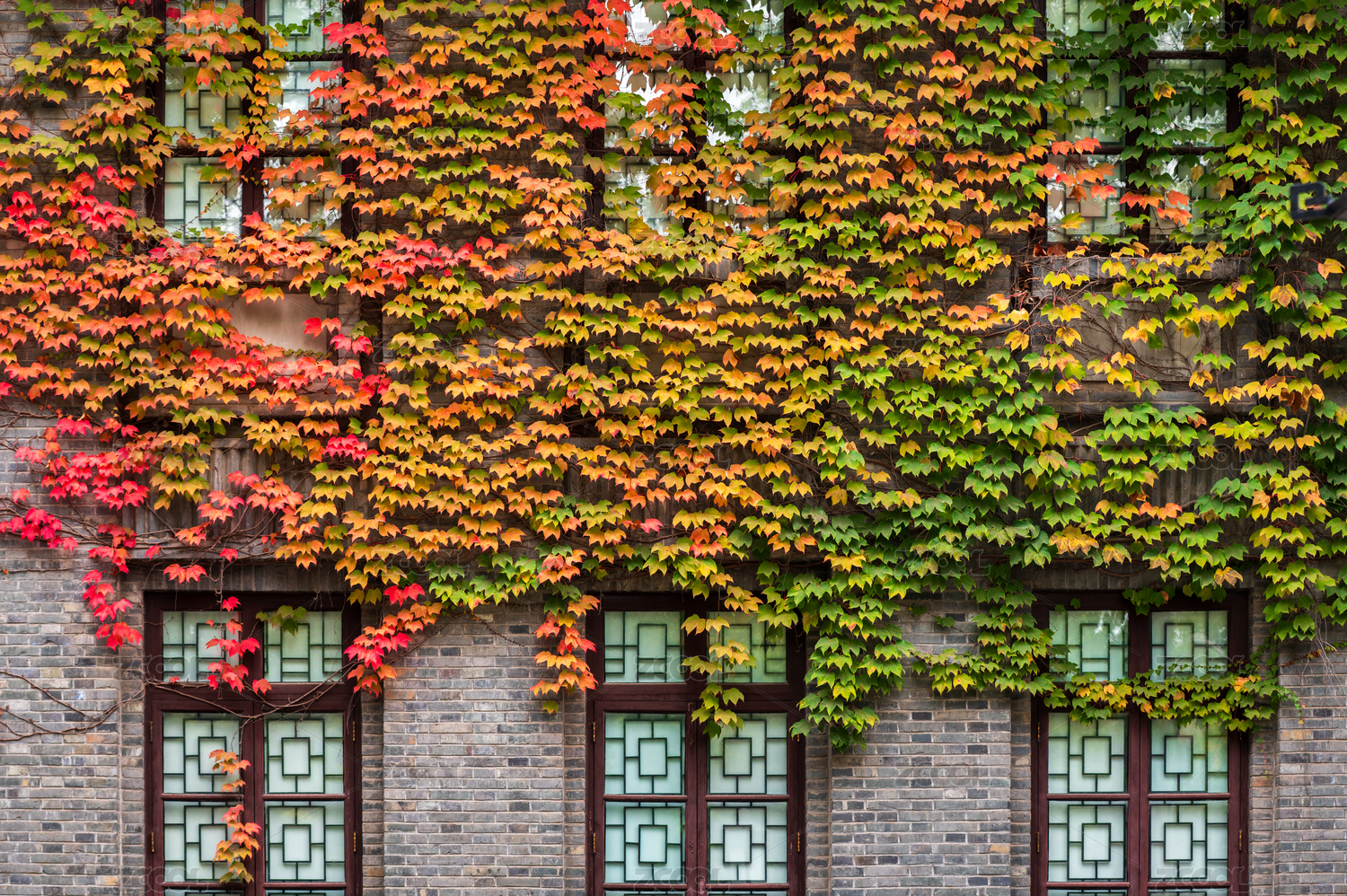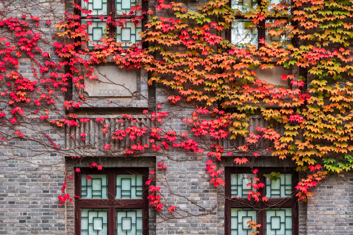 秋天南京总统府景区花窗边的爬墙虎