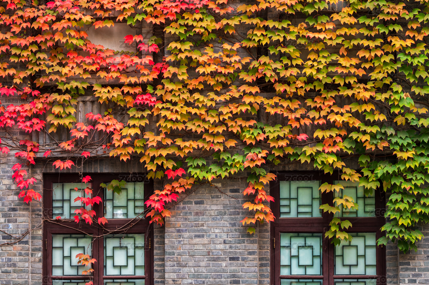 江南水乡乌镇马头墙屋檐爬山虎秋色