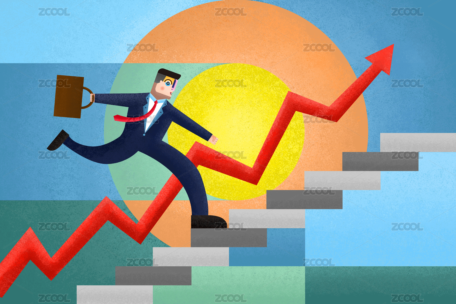 商人顺着箭头向上快速奔跑的扁平简约插画