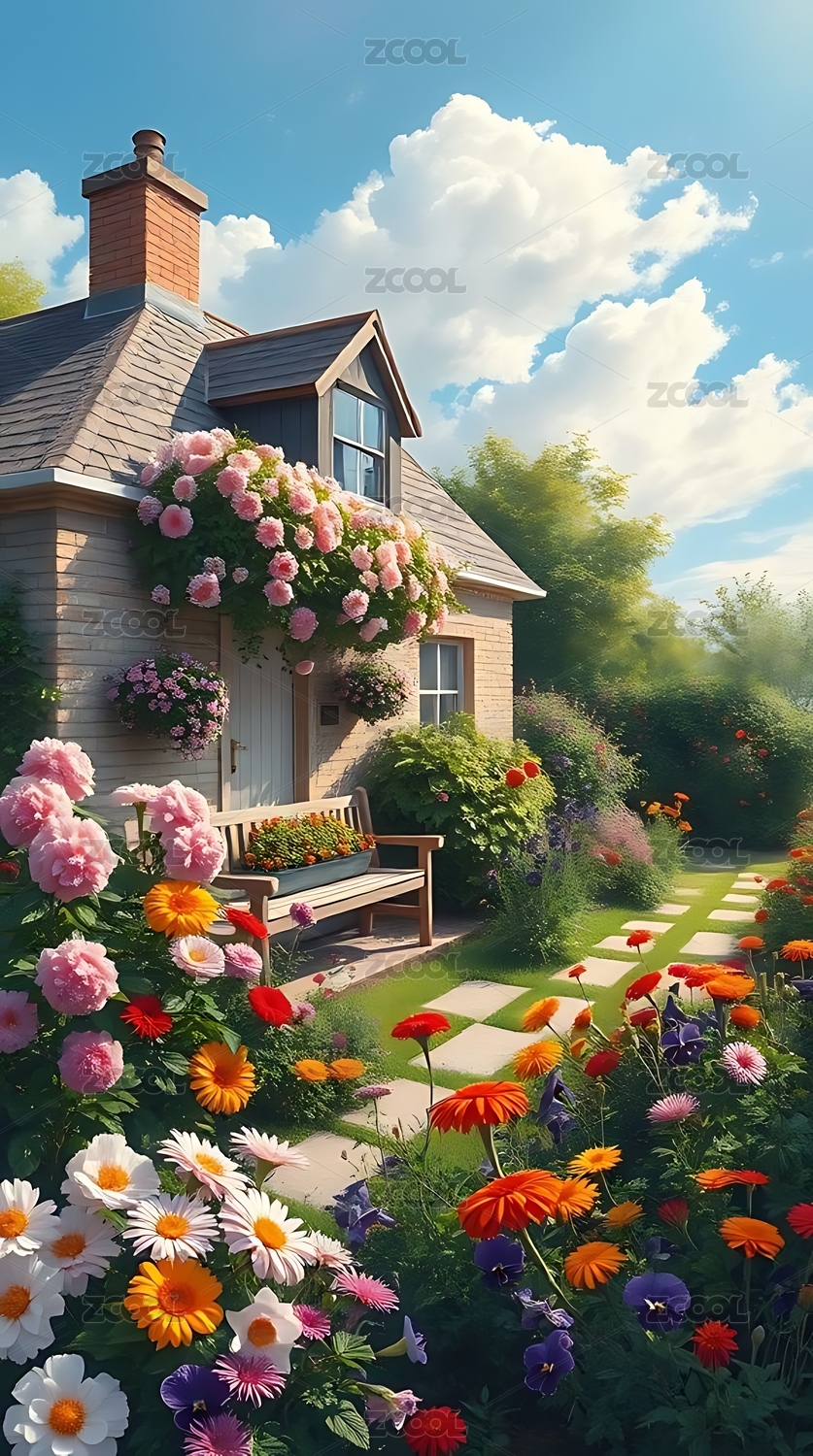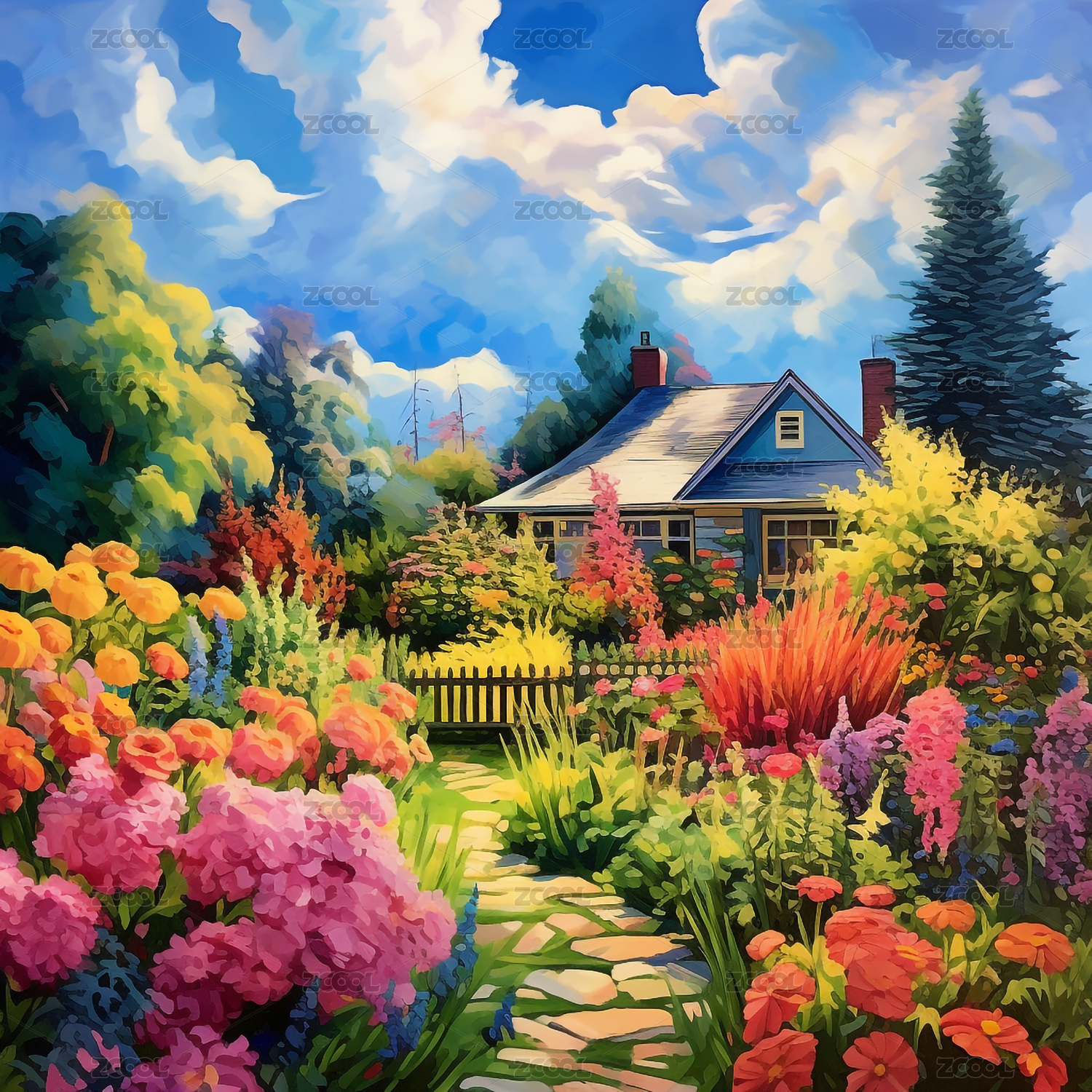 美式花园,乡村别墅,油画,插画,庭院,花房,装饰画,彩色花园,花园插画,复古