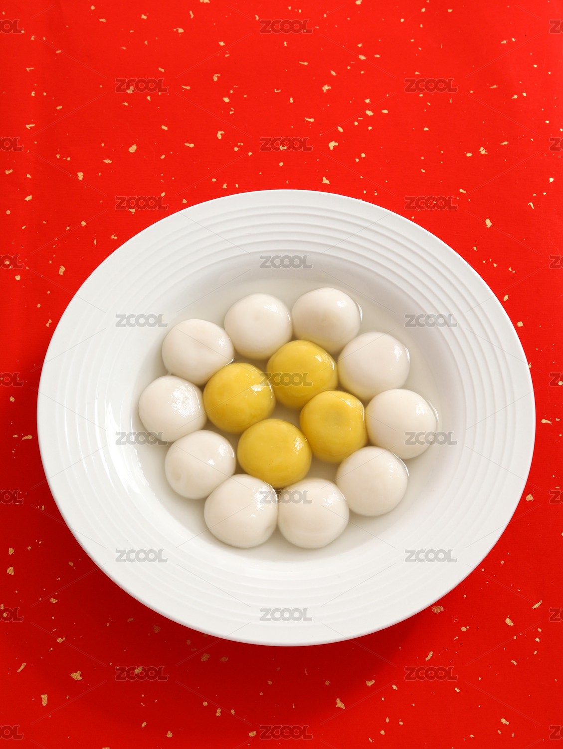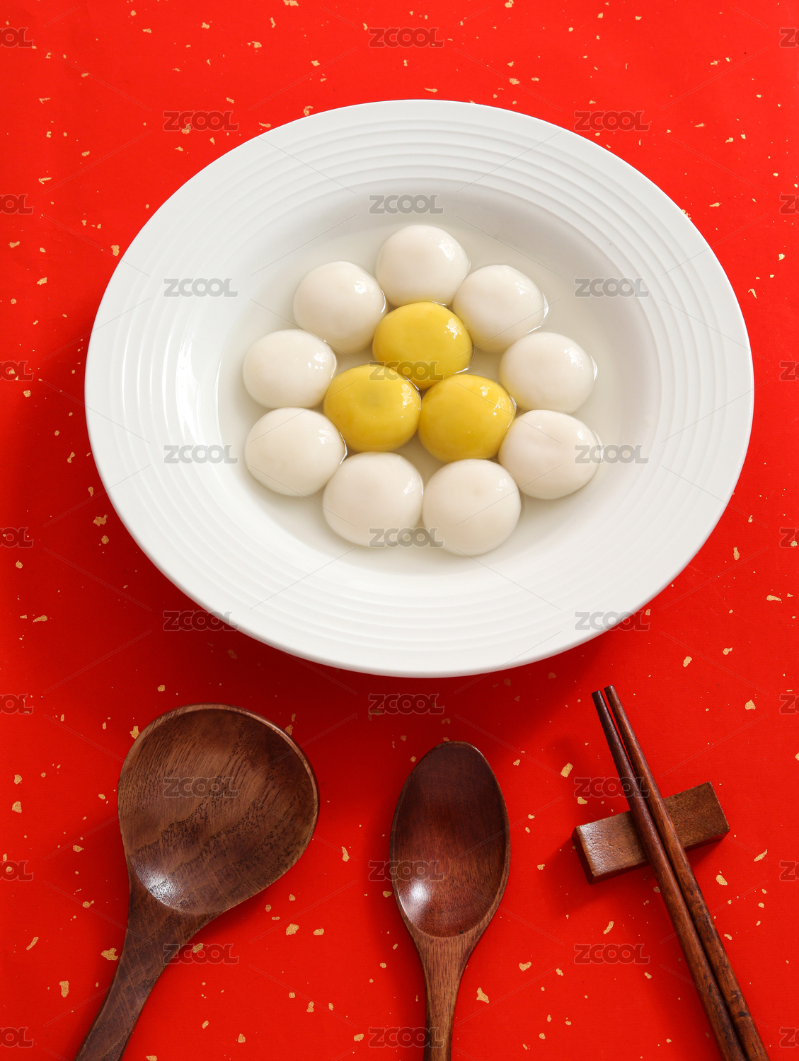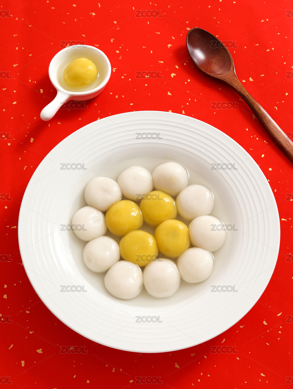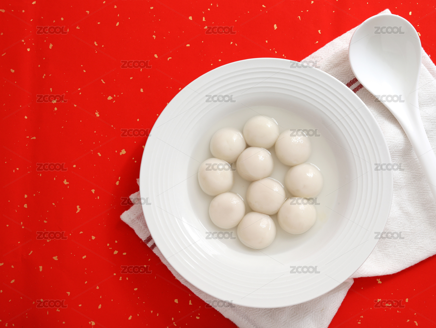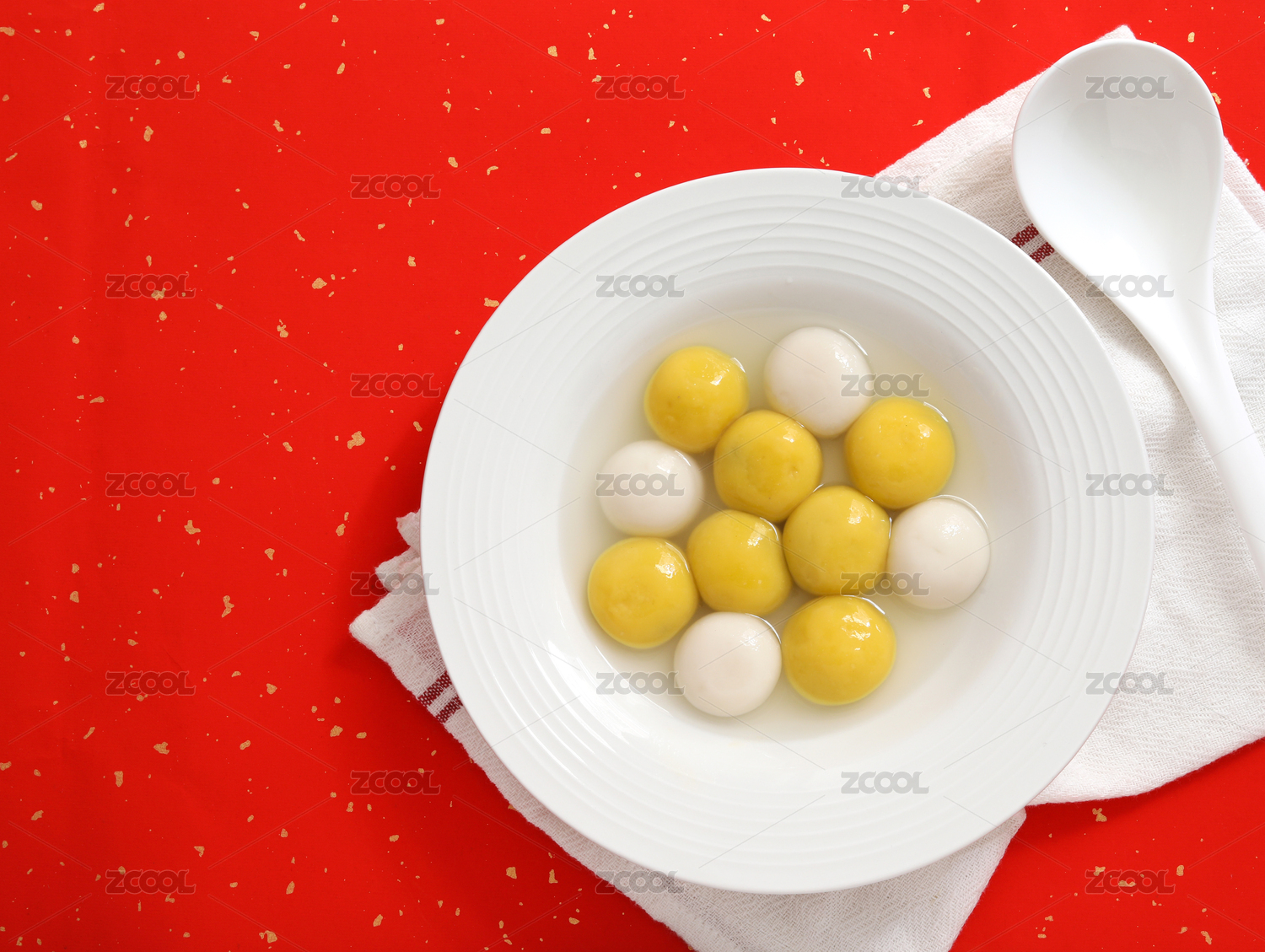 红色背景上,中国传统节日元宵节冬至的汤圆