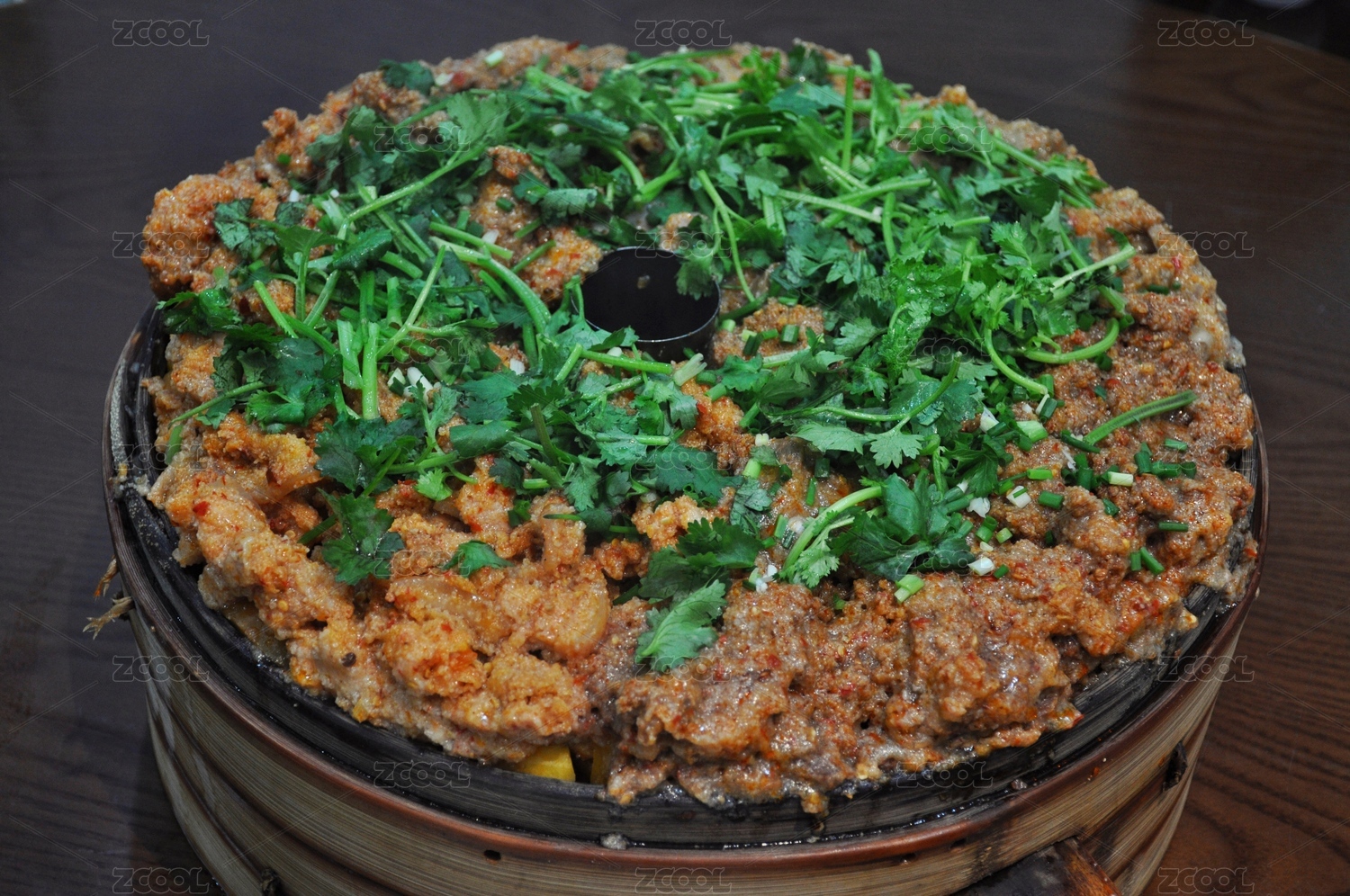 蒸笼上的粉蒸牛肉及蒸小米饭
