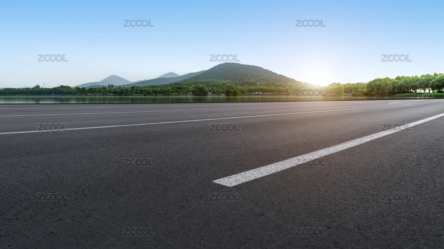 道路地面和远山湖泊绿树林