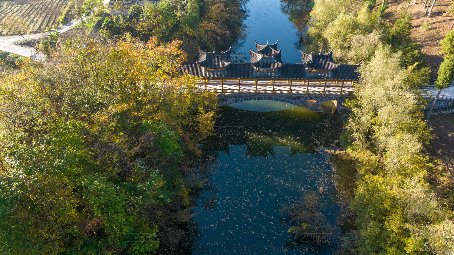 中国湖北鹤峰董家河,风雨桥边秋景如画