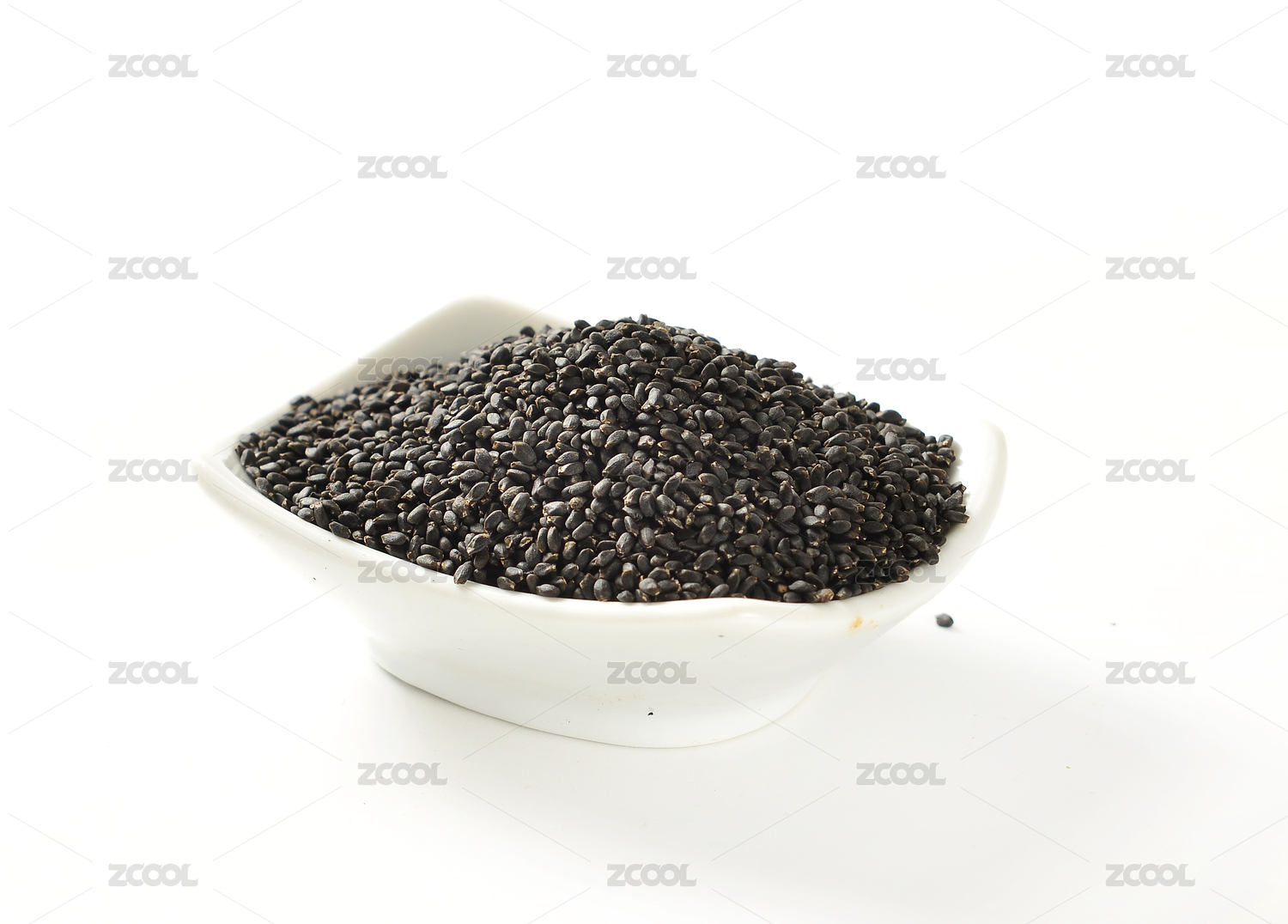 白底上俯拍碗和勺子装着的黑芝麻粒