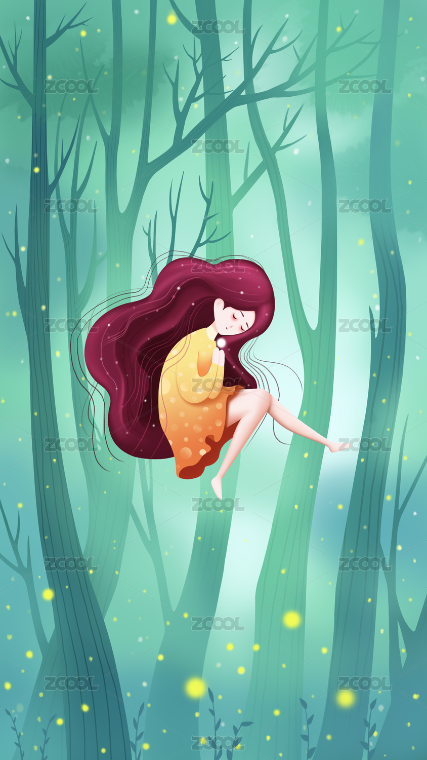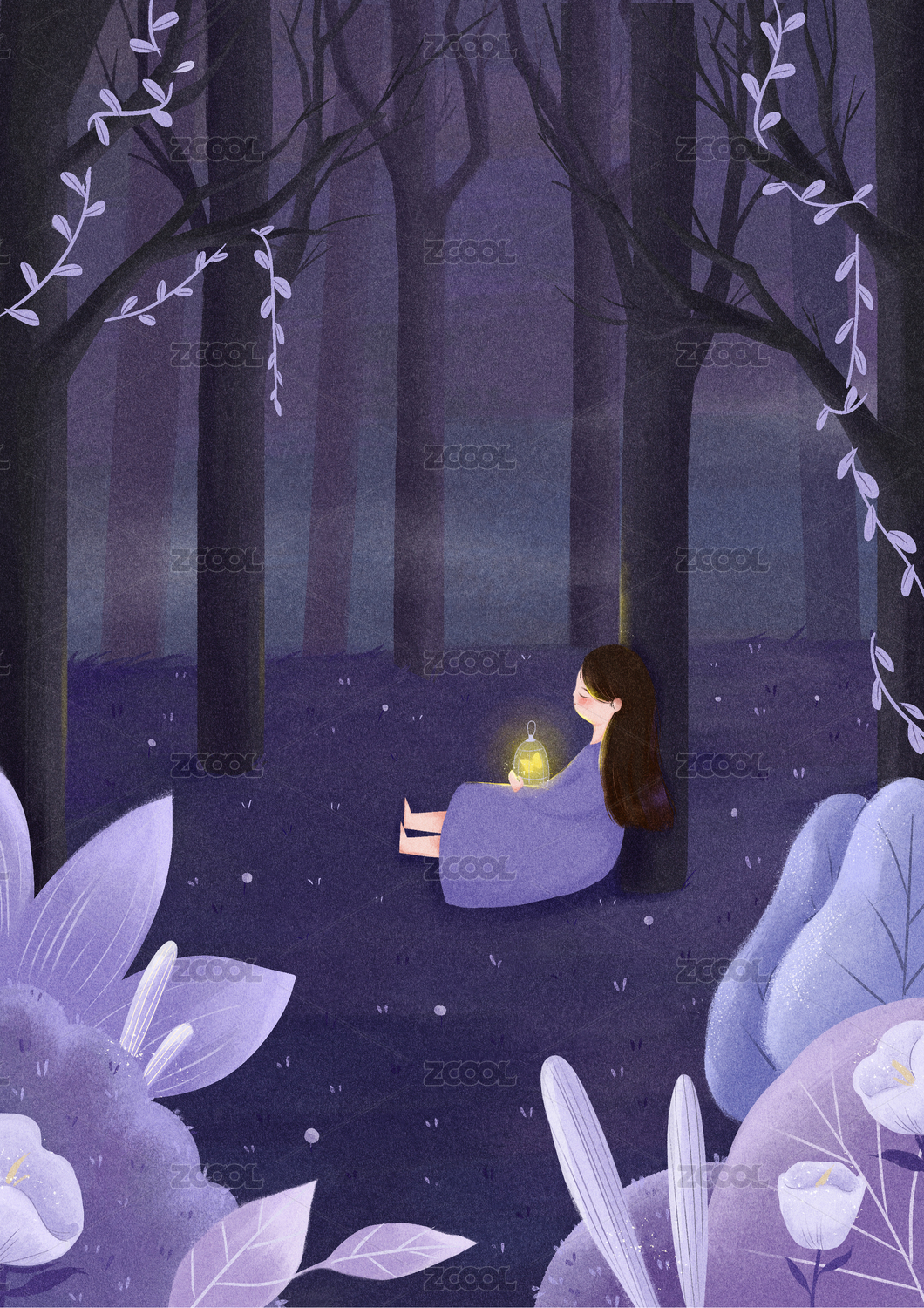 插画女孩和白熊拥抱夜晚温馨手绘场景