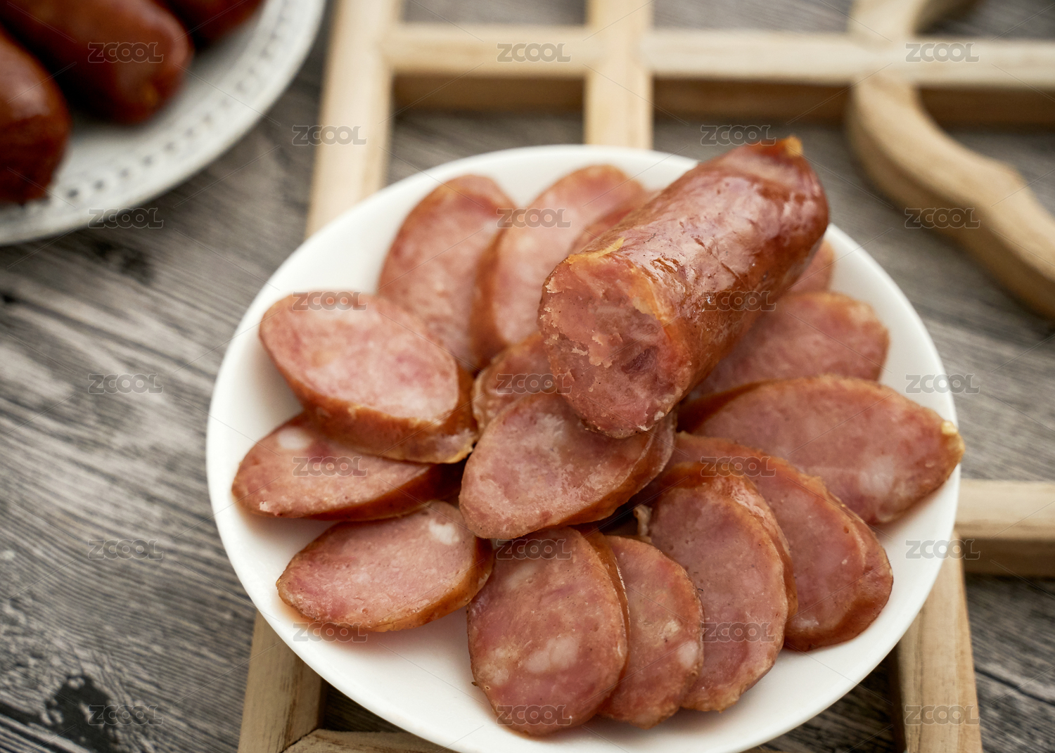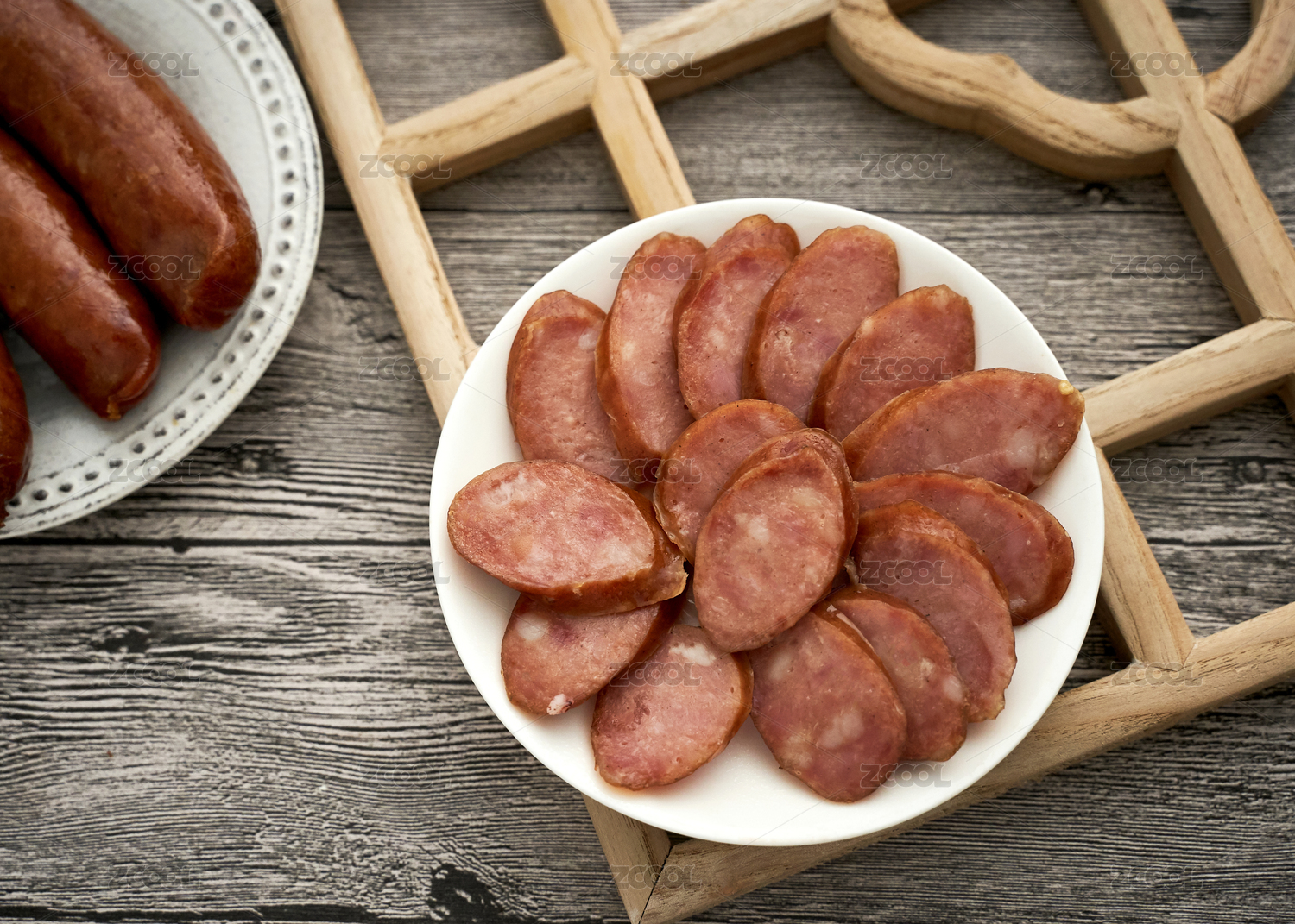 木纹背景上餐盘里摆放的哈尔滨红肠