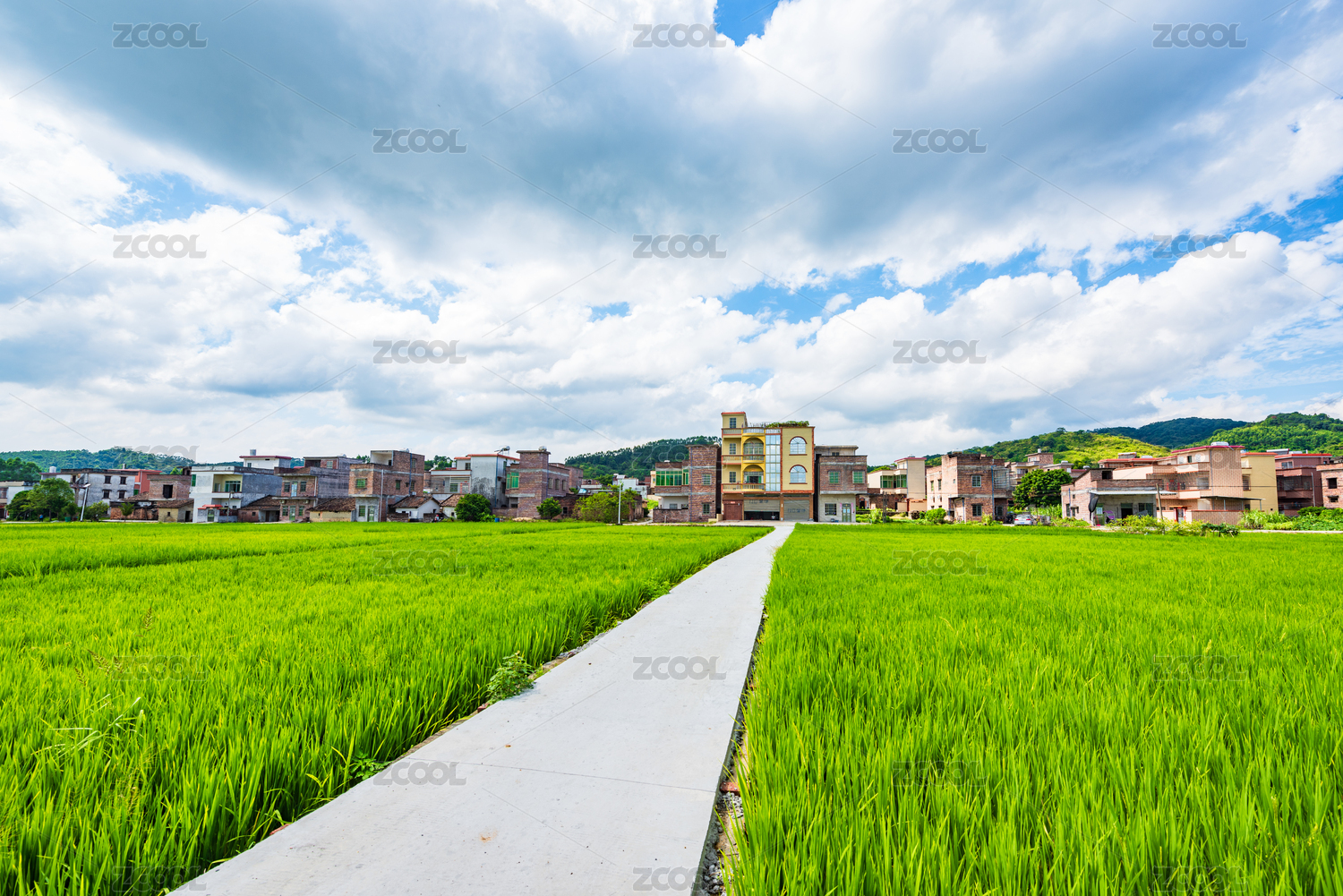 水稻田中间的一条水泥路及远处的民房,中国福建永定