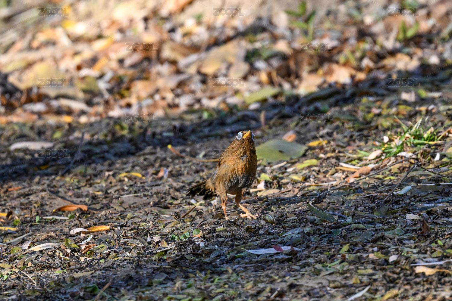 秋天斑鸫在落满果子的地上觅食
