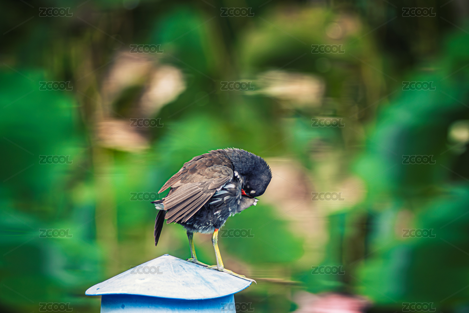 一只黑水鸡在荷花池塘中嬉戏觅食