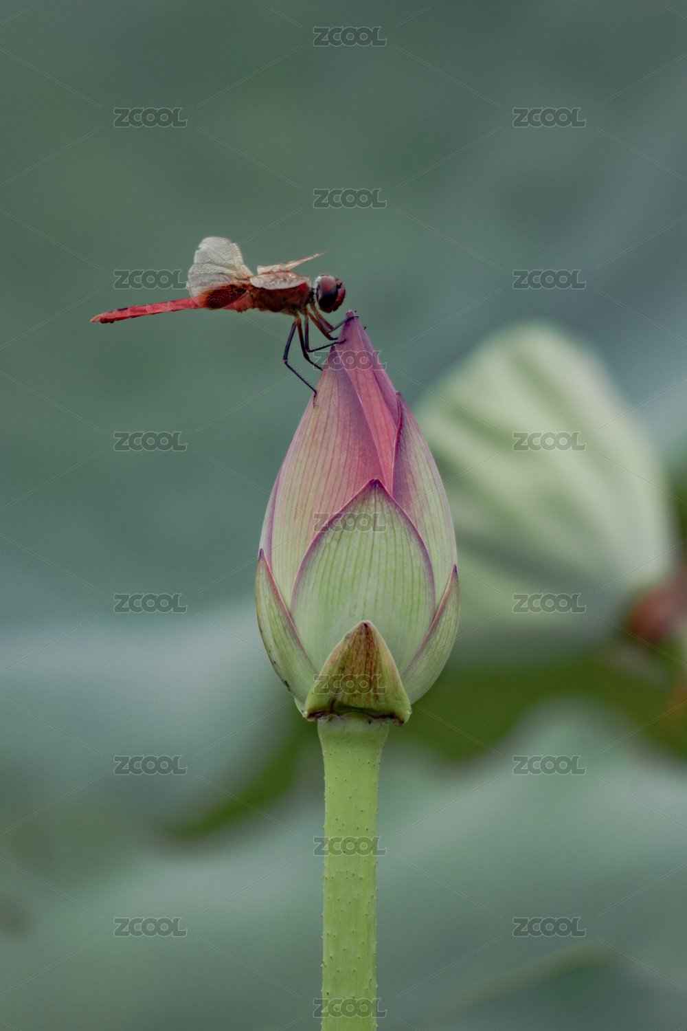 一只蜻蜓(斑麗翅蜻)在荷花花蕾上停留,特写镜头