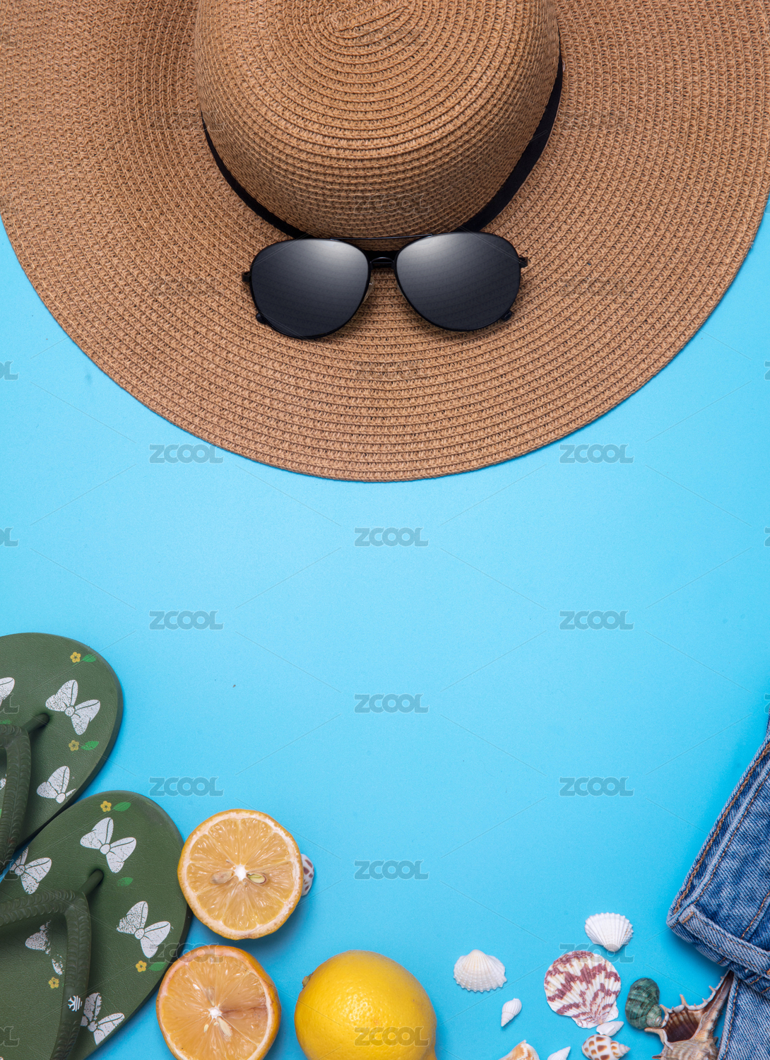 青底上摆放的草帽墨镜和海螺贝壳