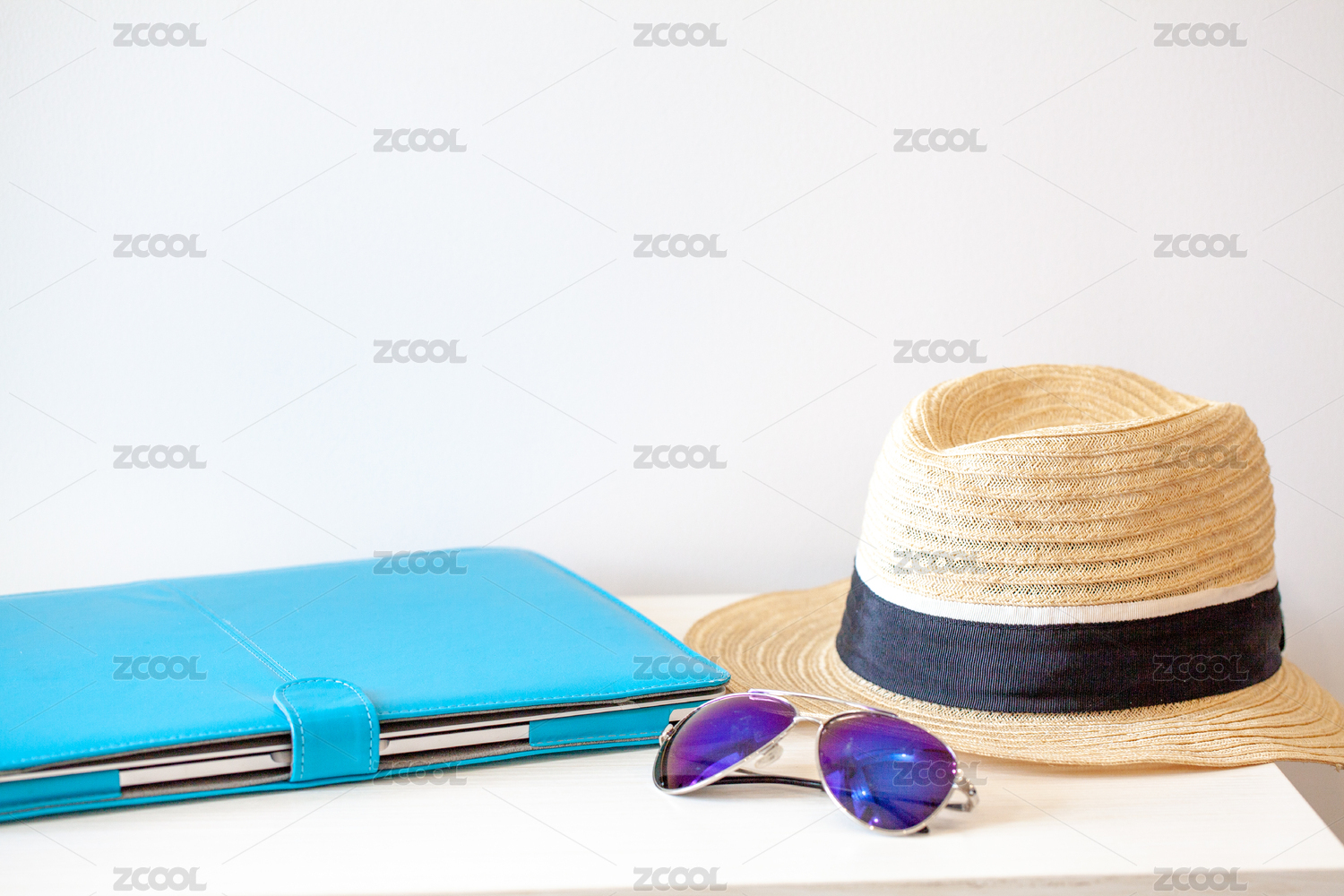 草帽,太阳镜和笔记本放在白色桌子上
