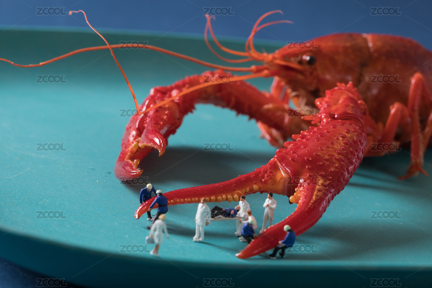 迷你小人和小龙虾 微拍小龙虾 缩微摄影小龙虾