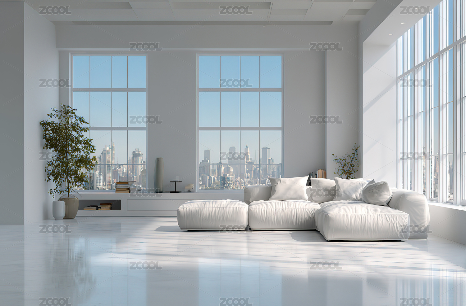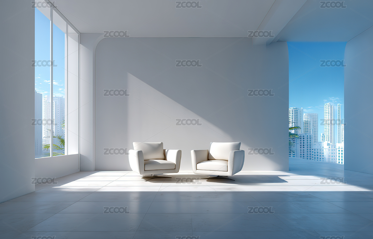 落地窗建筑内部大理石展厅带办公桌沙发窗外