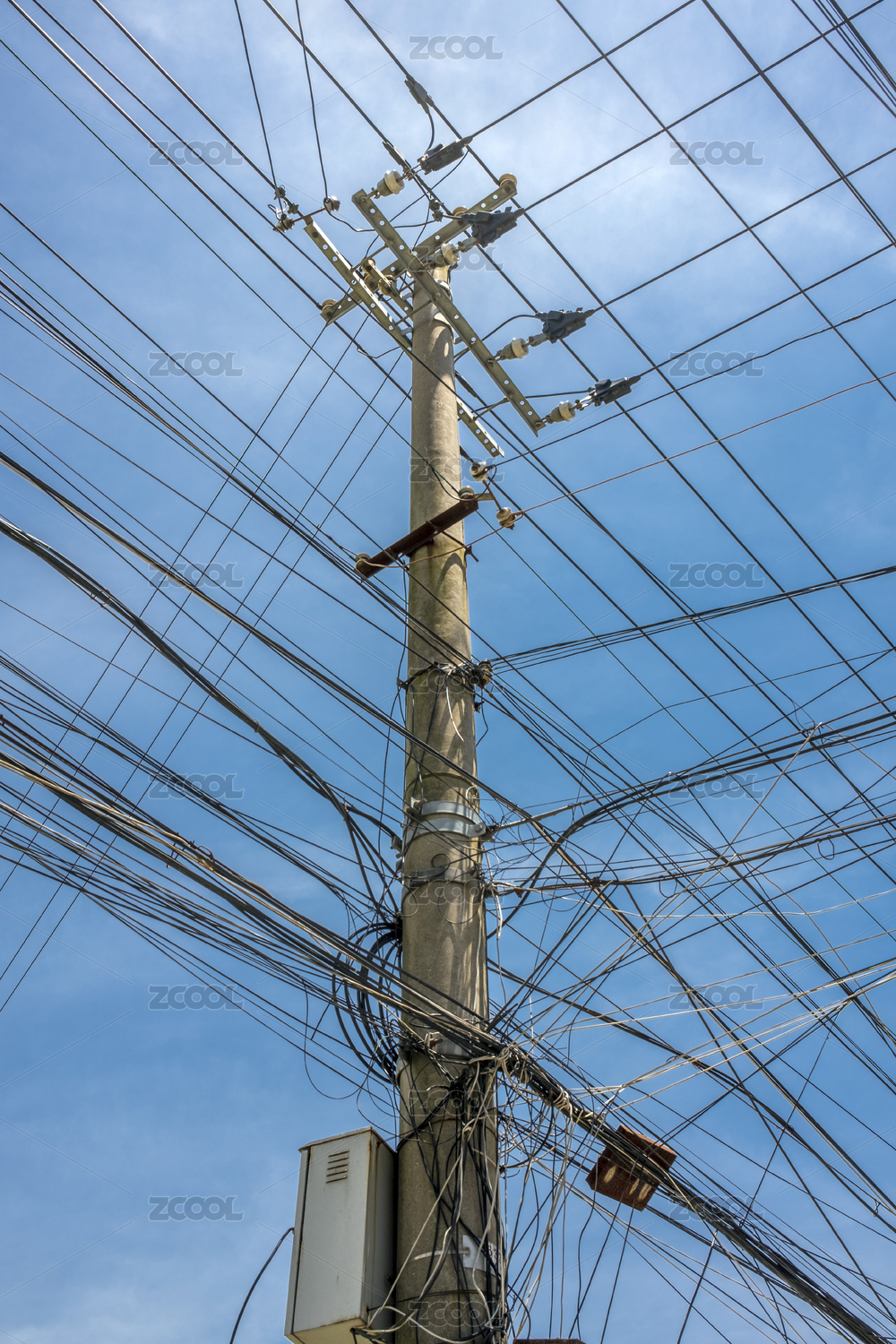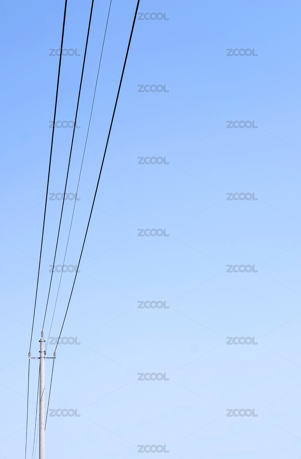 蓝天下的电线杆特写
