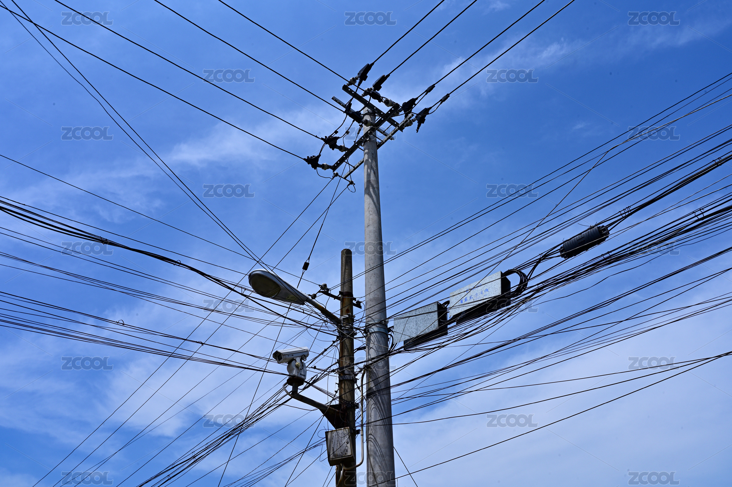 蓝天下的电线杆