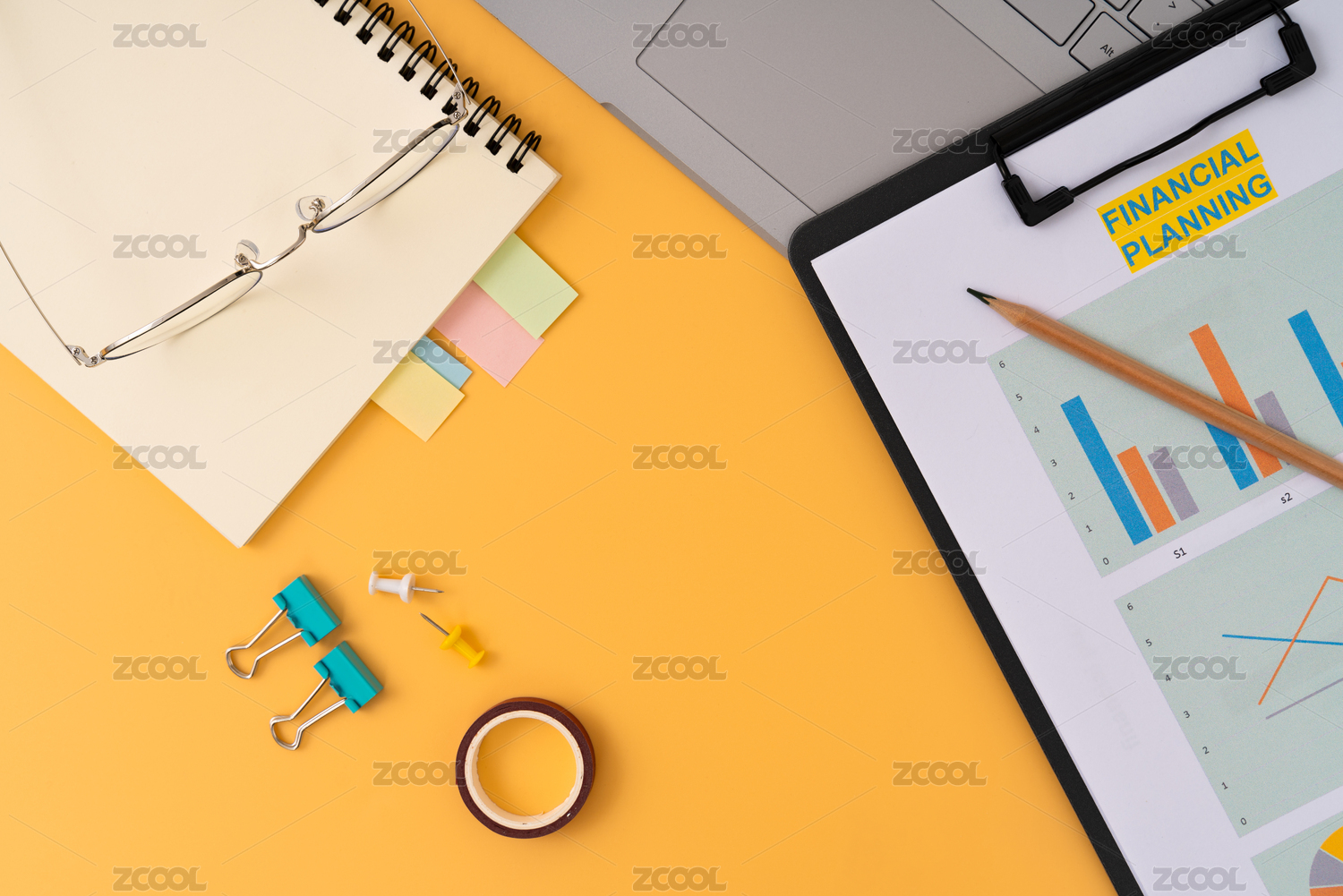 黄色背景上的财务计划表与电脑