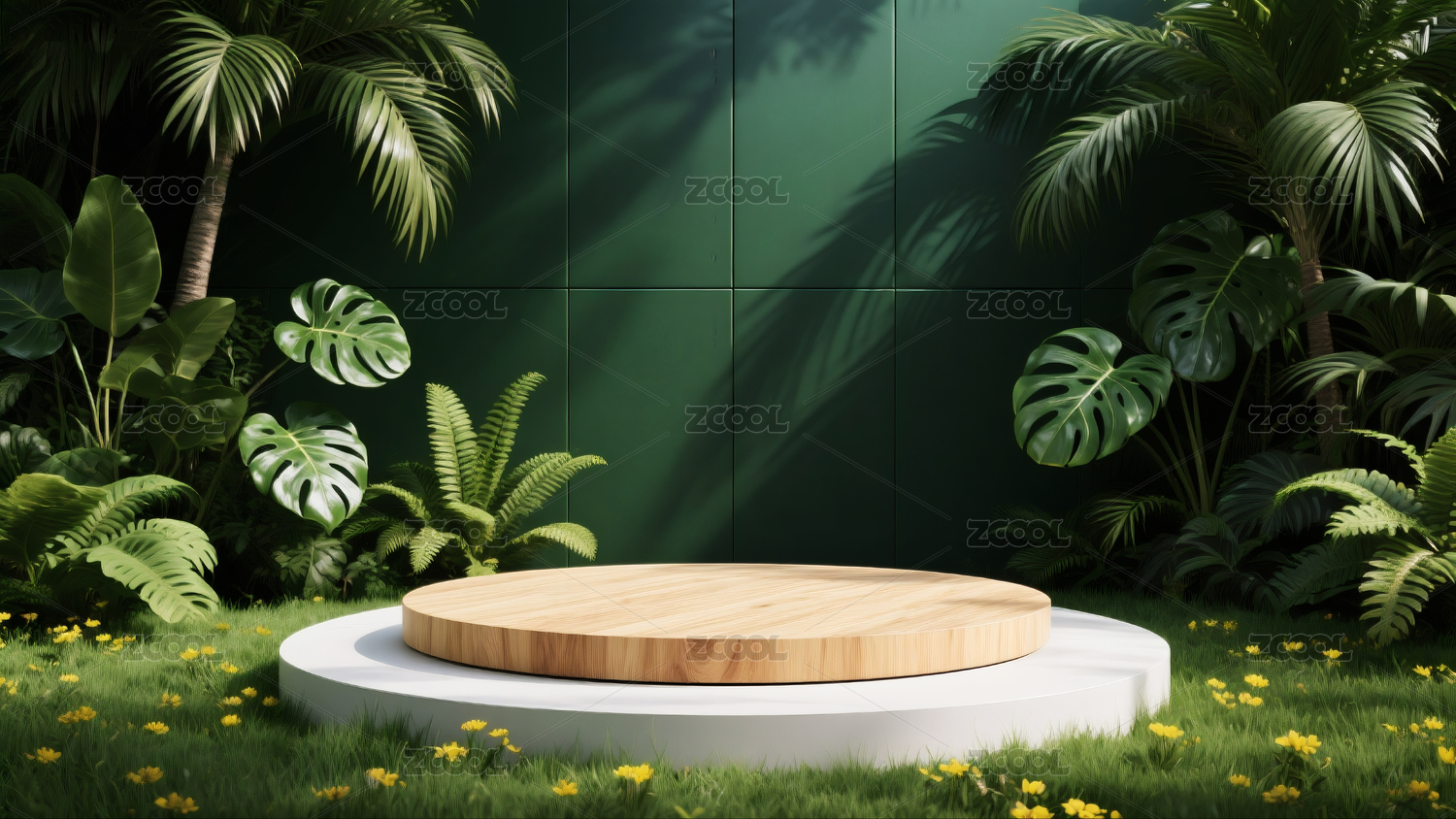 热带植物环绕的绿色背景圆形展示台