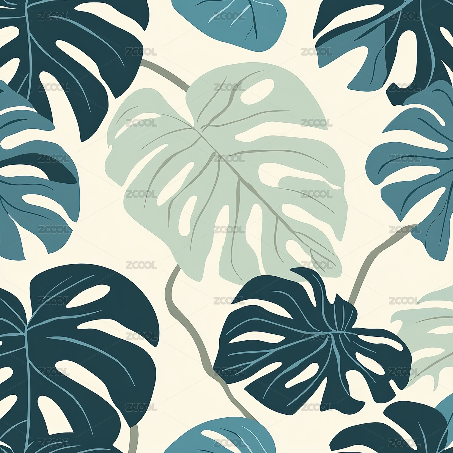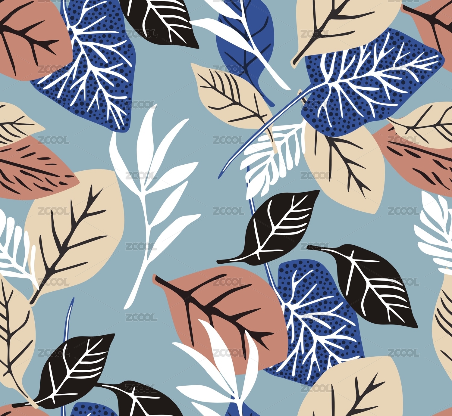 夏天彩色植物叶子四方连续循环无缝拼贴图案
