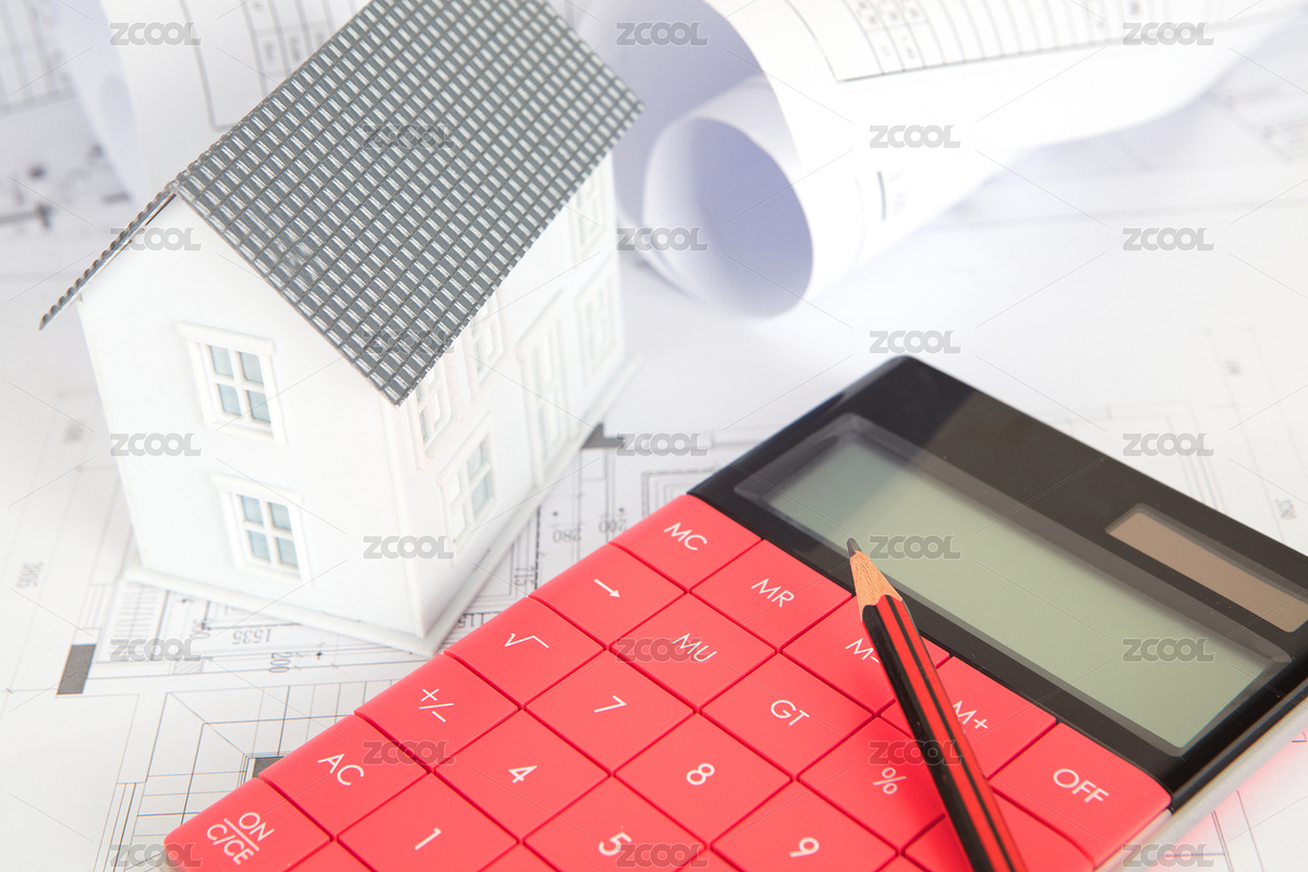 住房装修图纸上的小房子模型和计算器及一个铅笔
