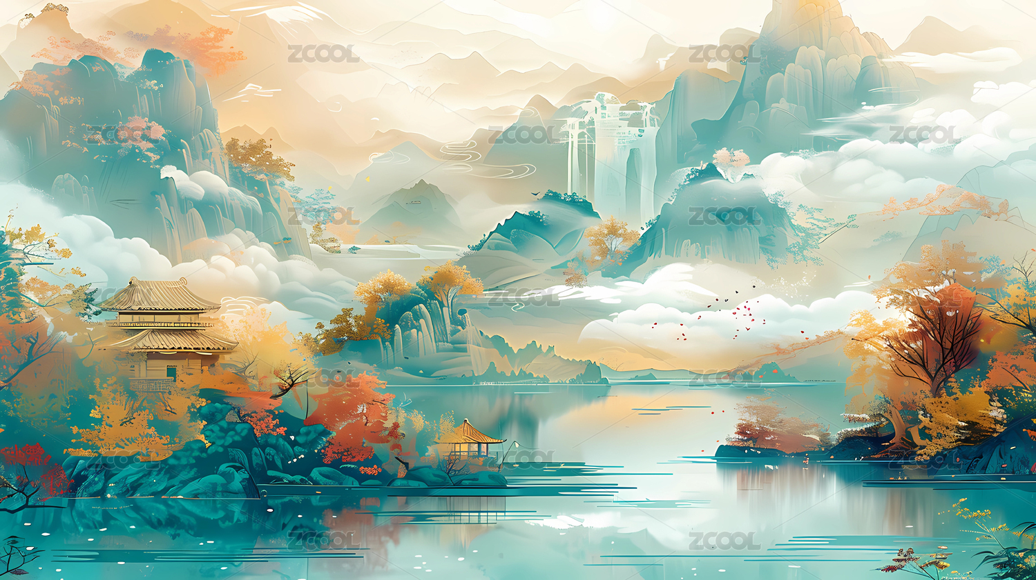 中国风中国山水亭台风景湖泊河流背景插画