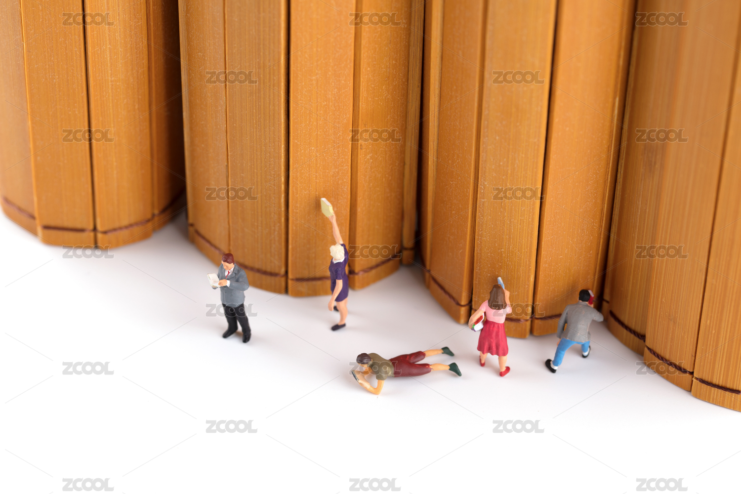 厚厚的一摞书和看书的微缩人偶模型