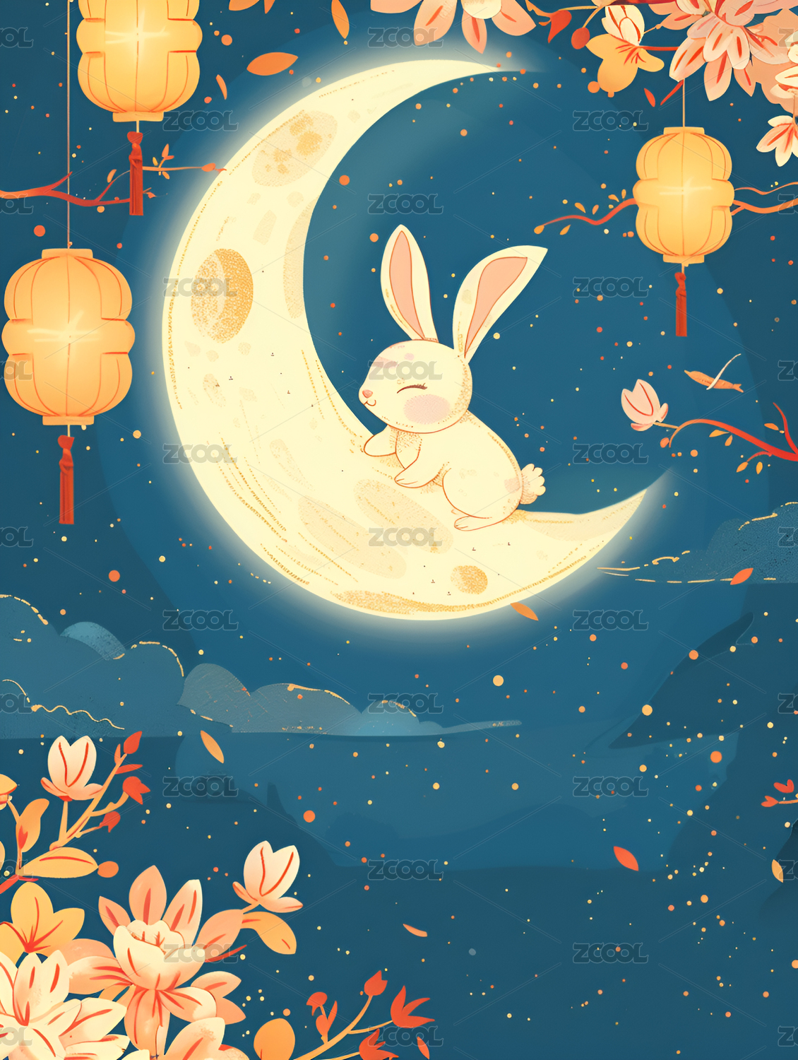 夜空中的月亮和白兔,中秋节海报插画