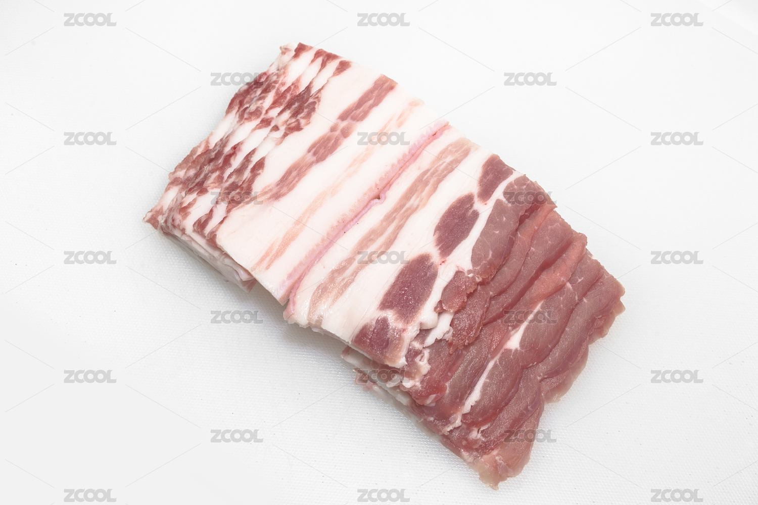 切片的五花肉放在白色背景上