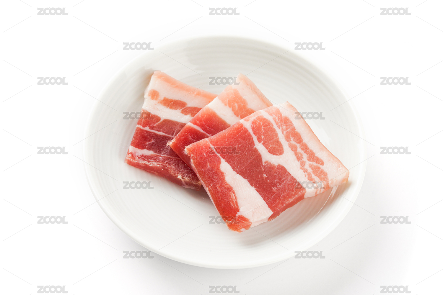 白色背景上餐盘中摆放的猪五花肉片