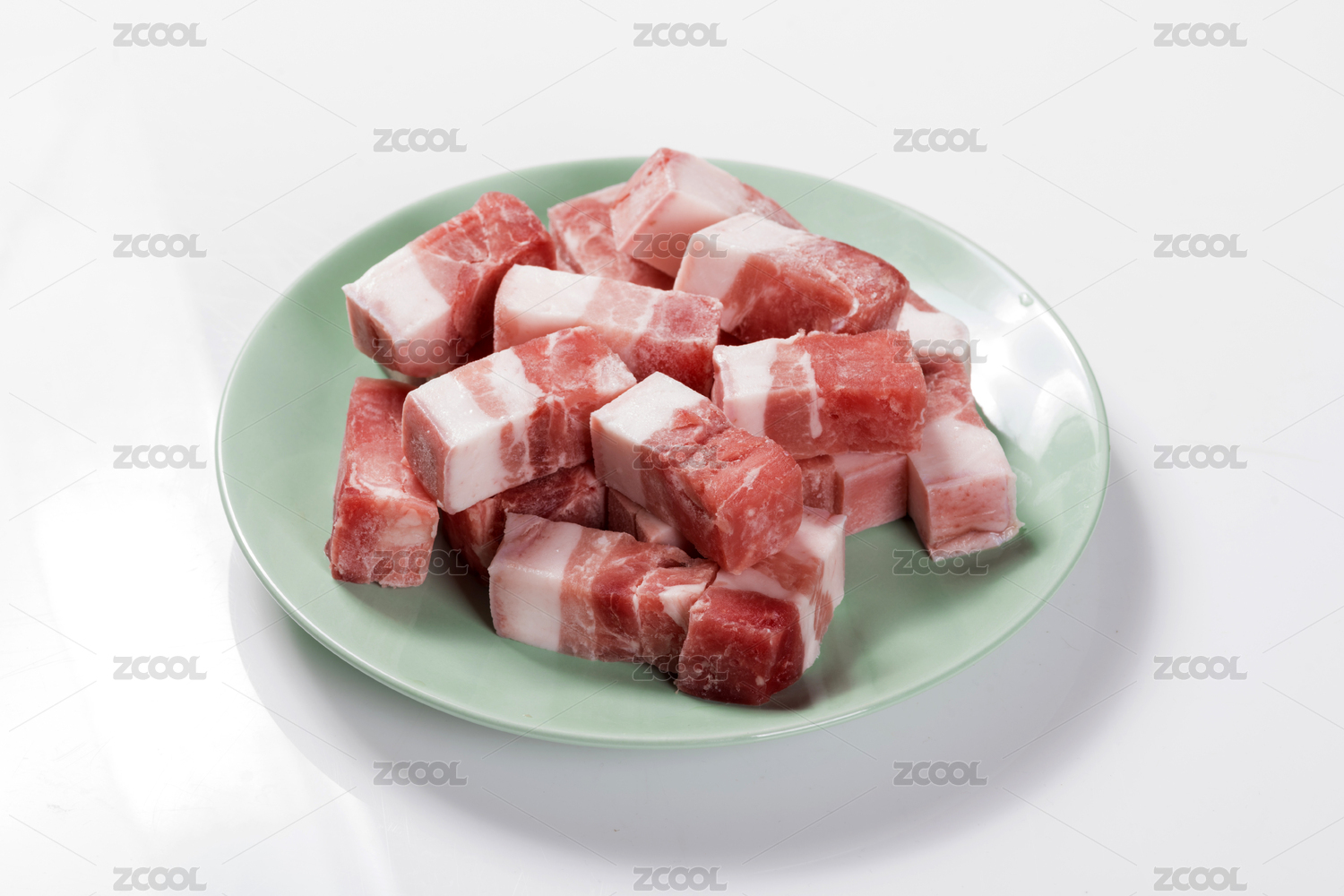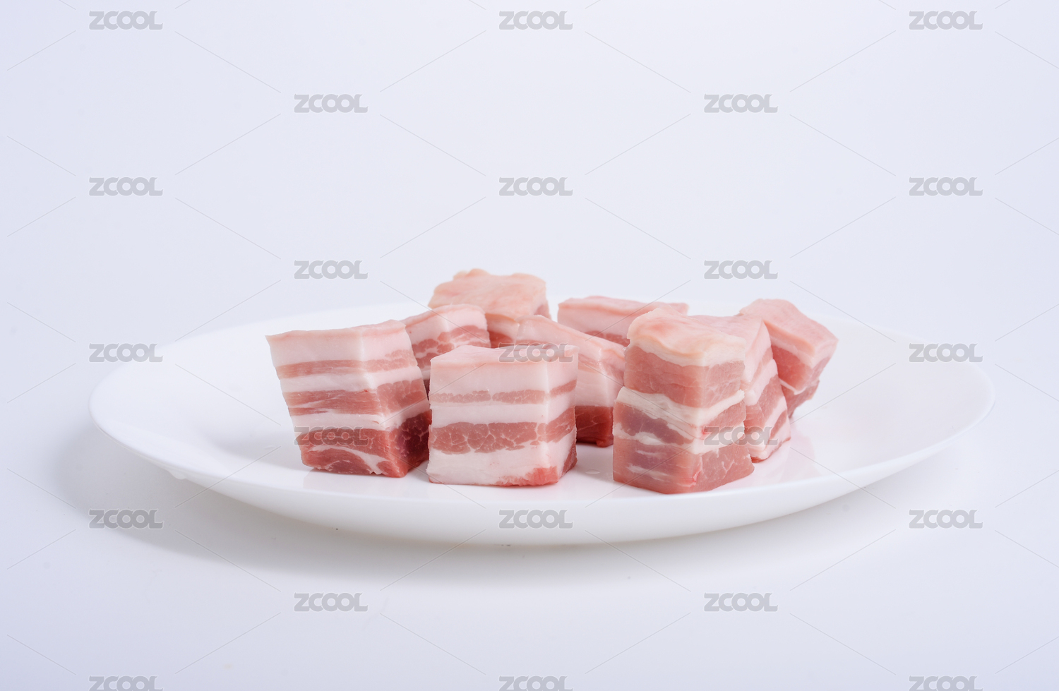 白色背景上白色餐具上摆放的猪五花肉