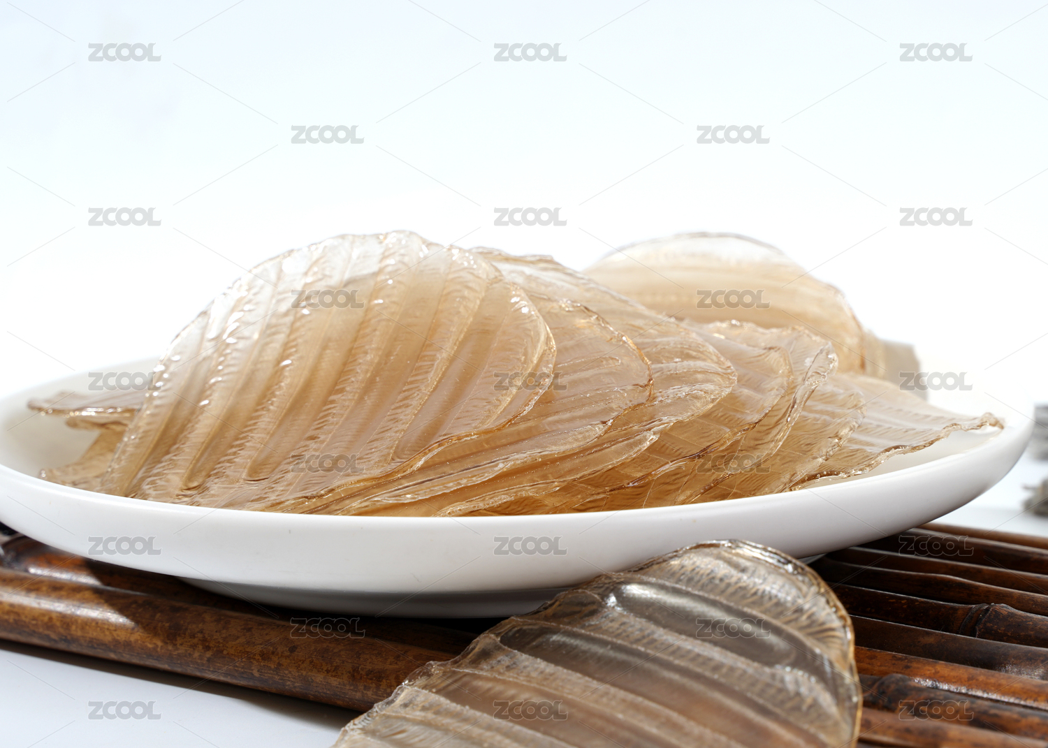 白色背景下装在竹篓中的圆形红薯粉皮