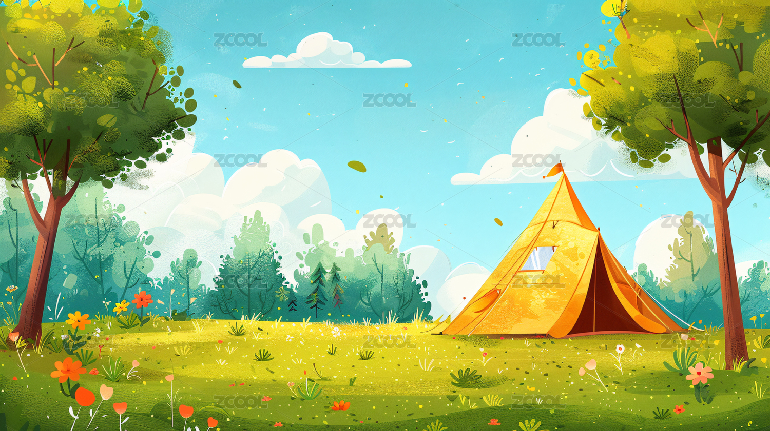 自然,风景,清新,插画,夏天,露营,春游,草地,帐篷,度假
