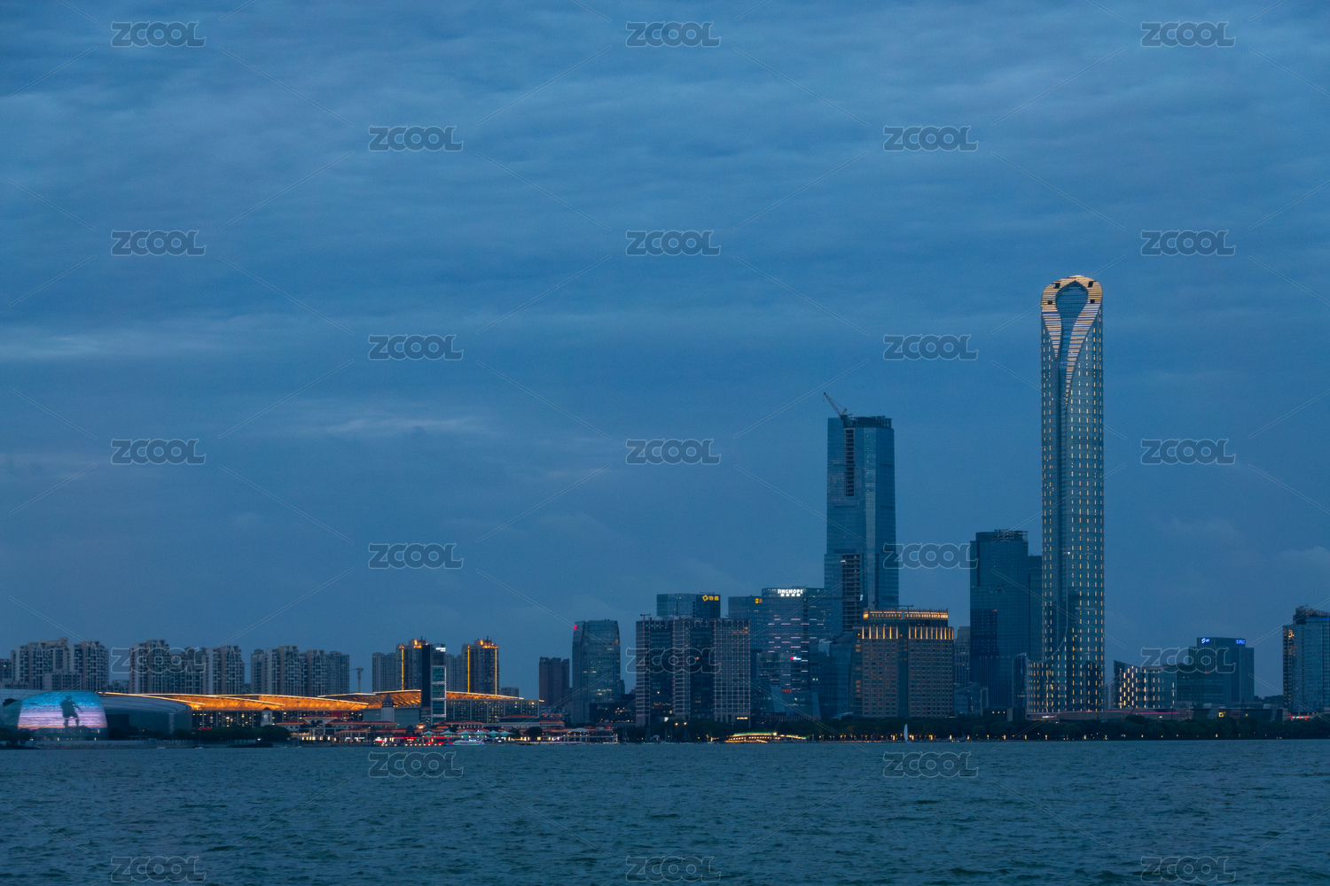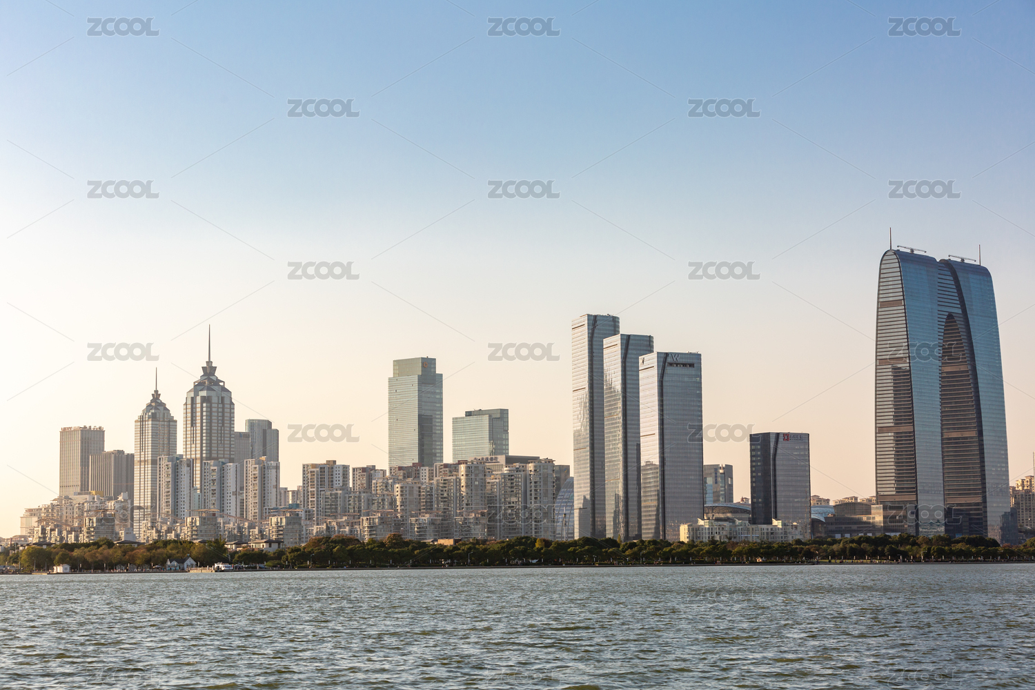 中国江苏苏州金鸡湖黄昏现代建筑天际线