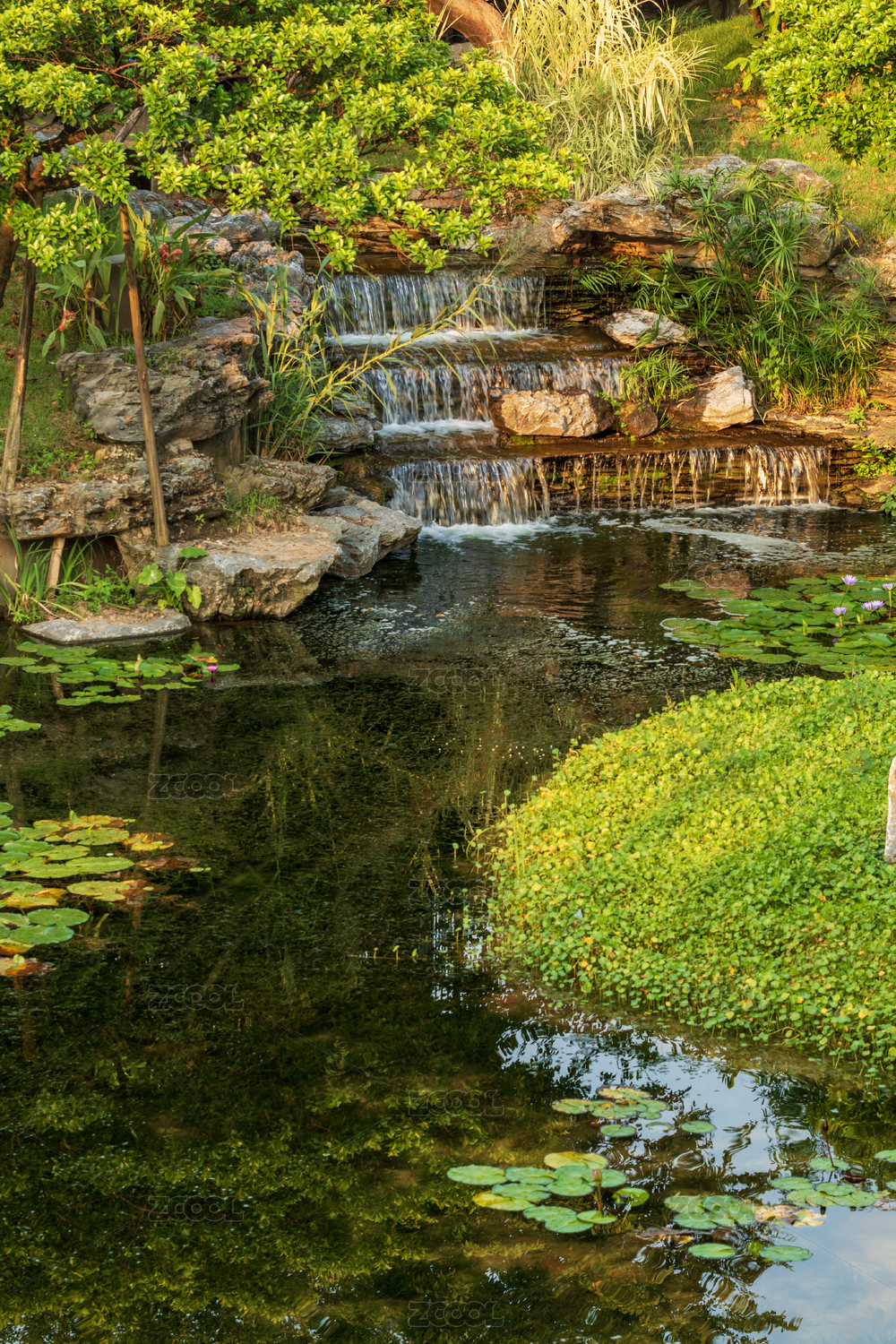 河南南阳卧龙岗文化园景区内奇石劲松瀑布