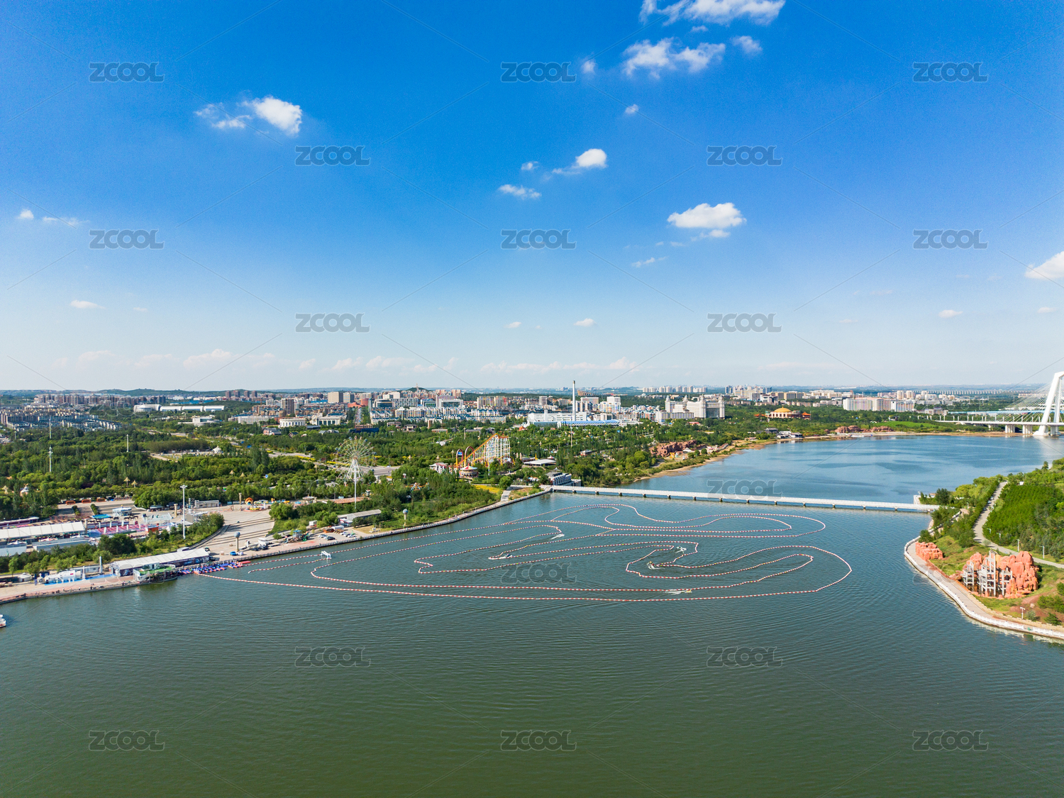中国山东东营清风湖公园航拍湖景局部俯视图