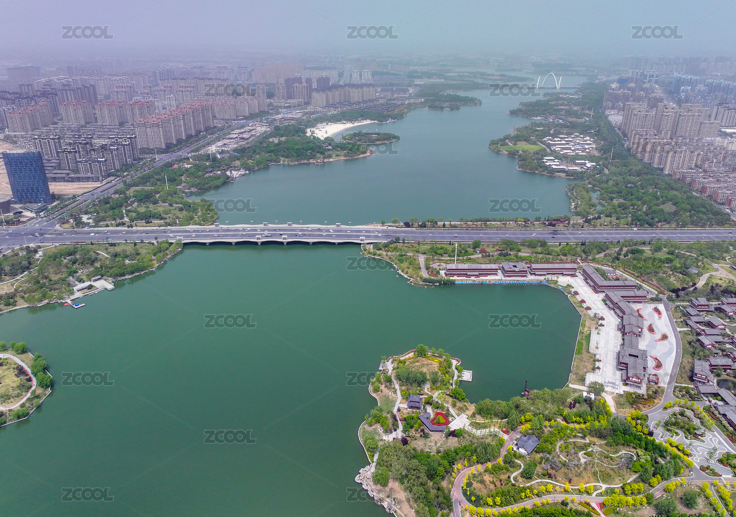 航拍中国河南郑州龙子湖公园湖泊湿地风光