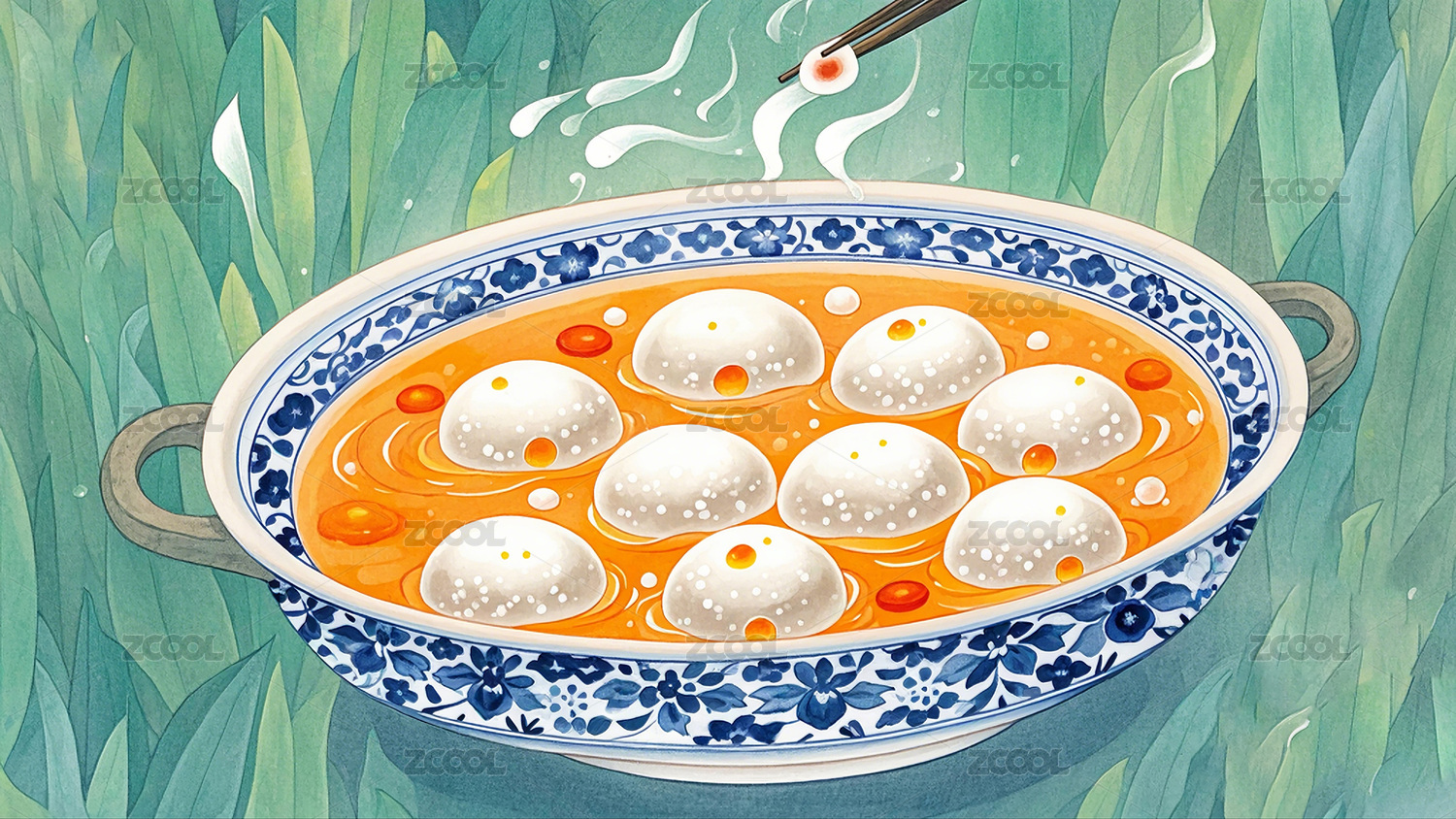 汤圆,插画,汤圆插画,国潮插画,元宵节插画,热腾腾的插画,重阳节,节日节气,工笔画,传统节日