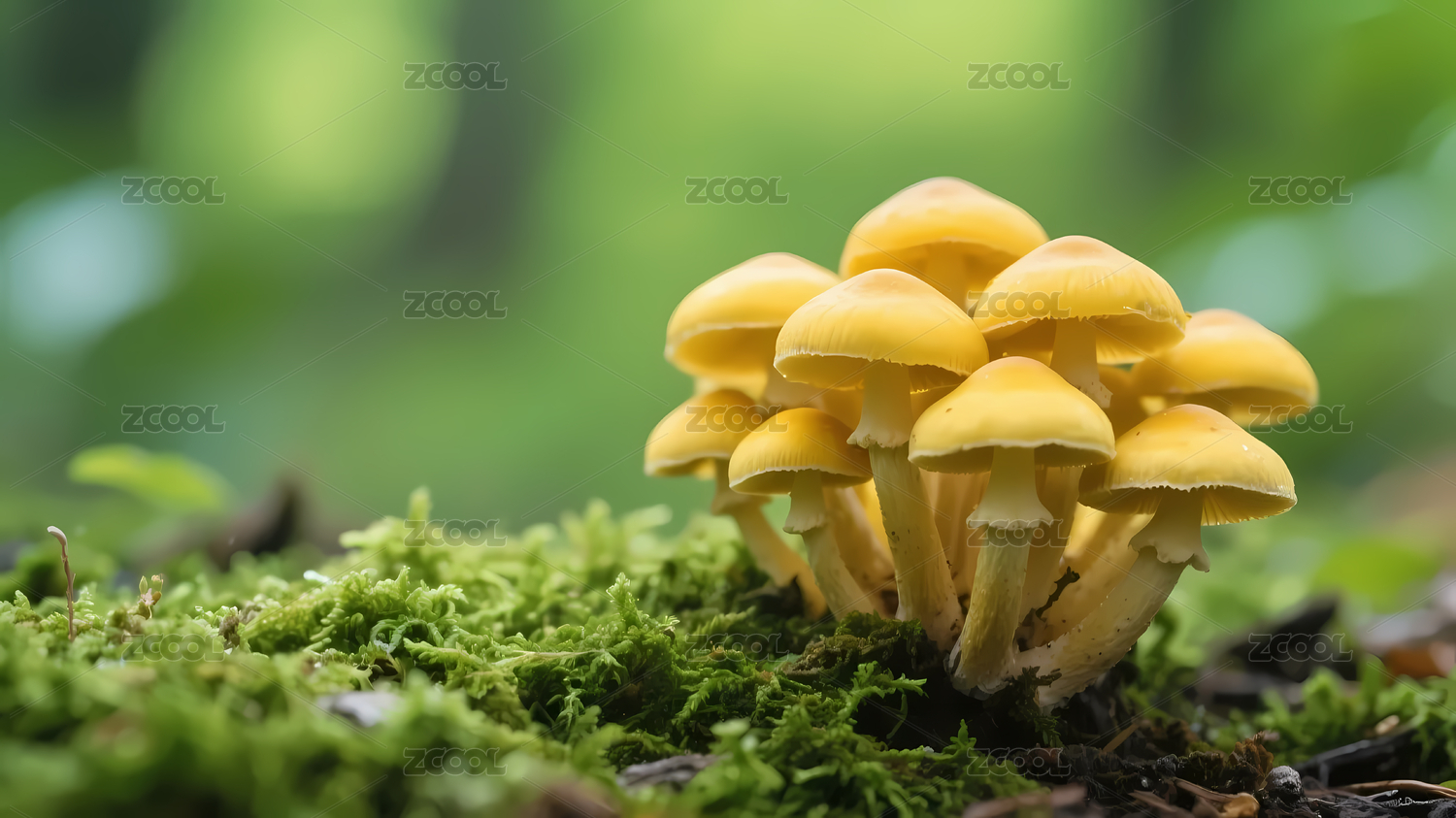 一组橙色蘑菇背景是湿润的绿色苔藓和植物