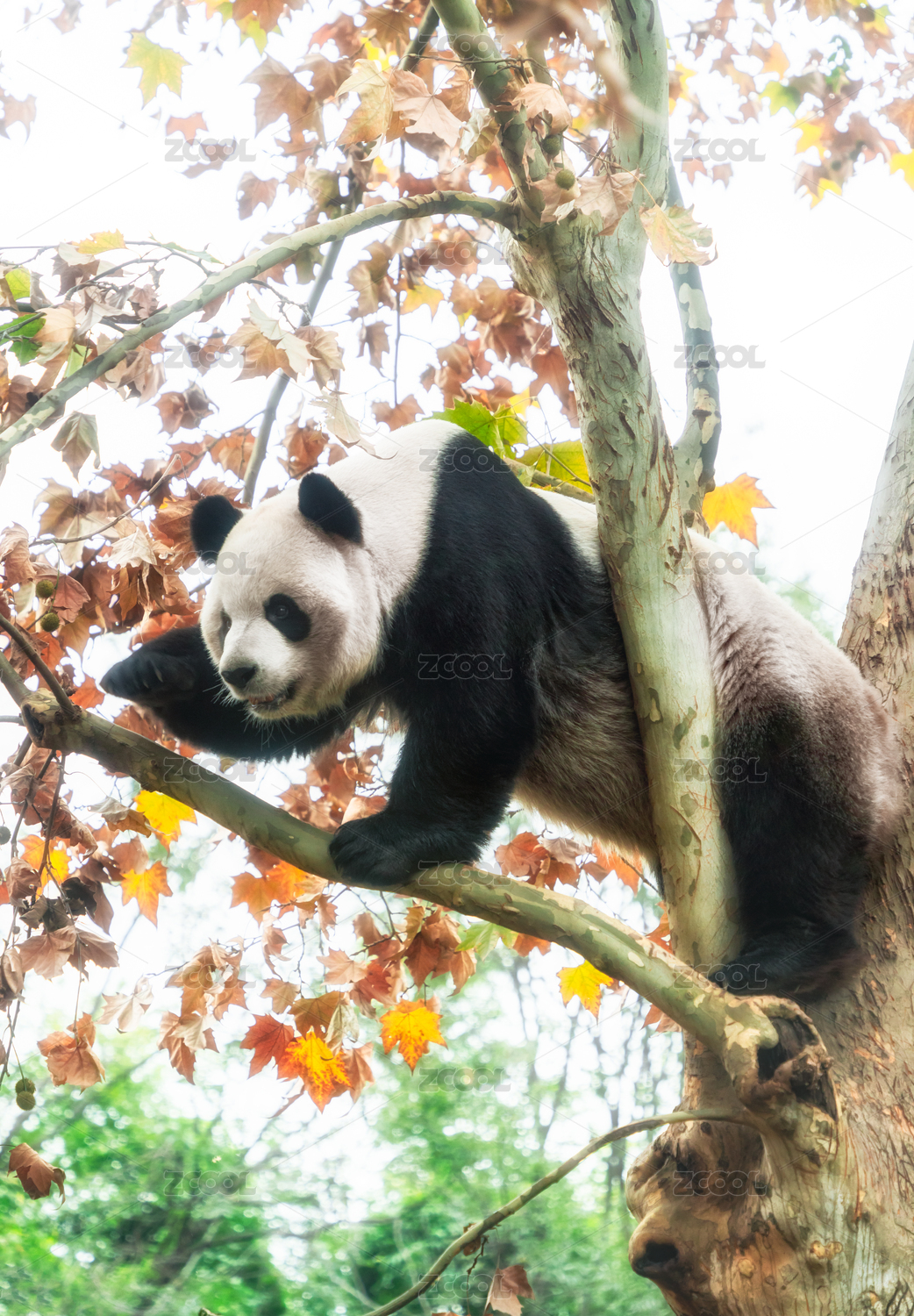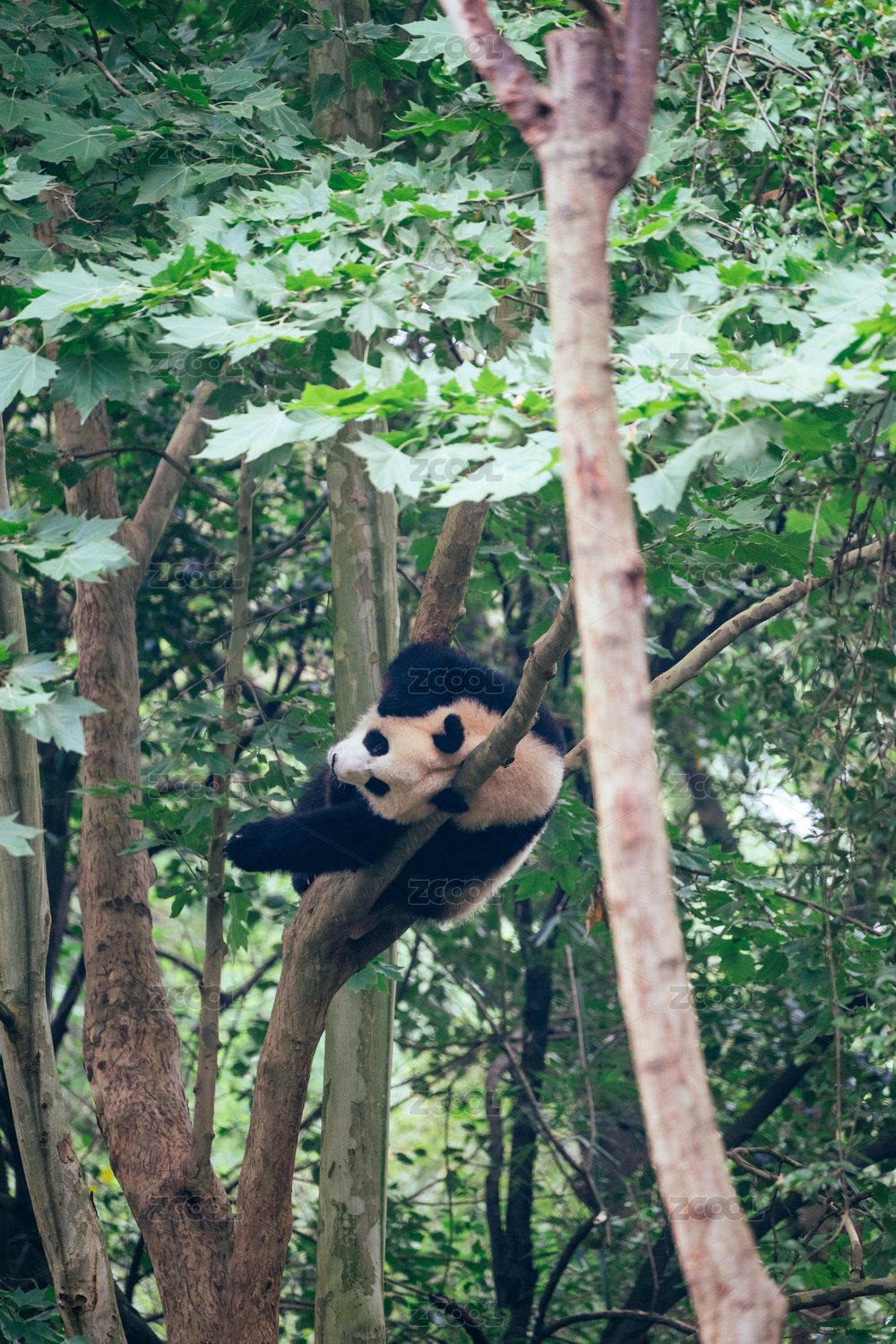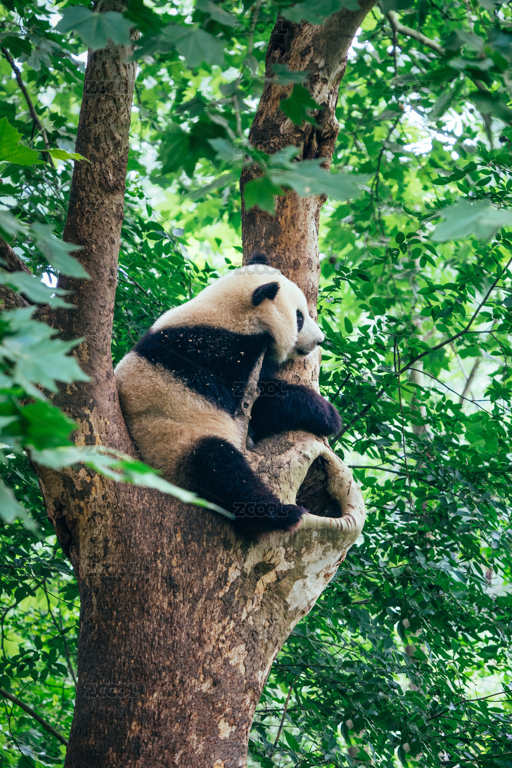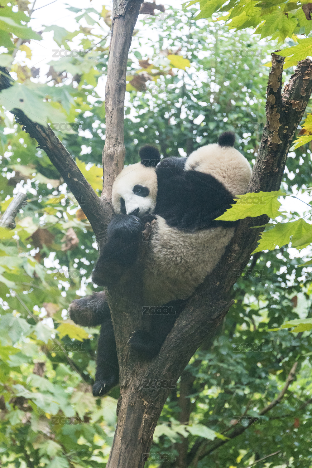 成都大熊猫繁育研究基地里挂在树上可爱熊猫