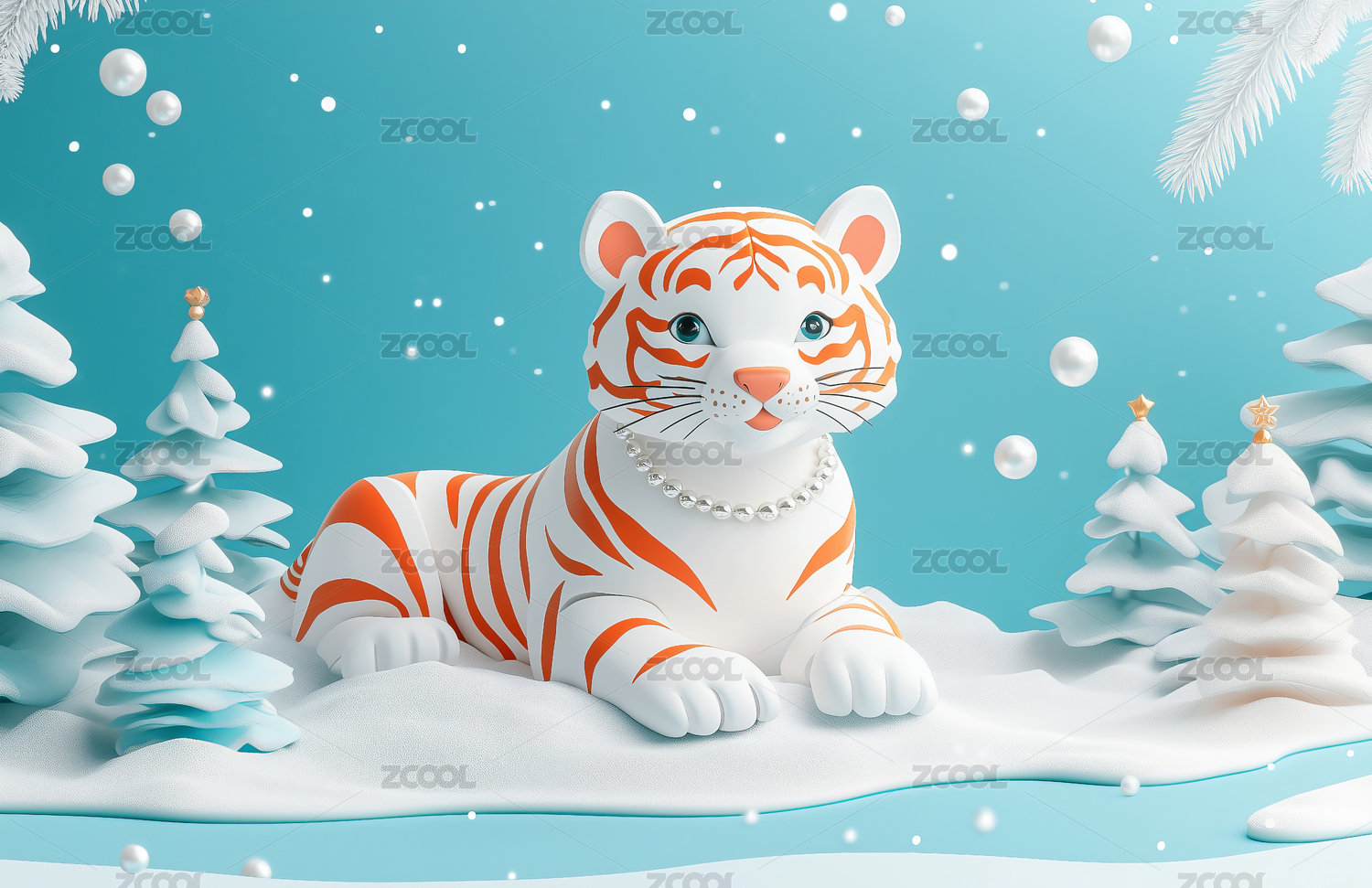 老虎,孟加拉虎,冬季,雪景,森林,树木,低多边形,3D渲染,温暖,金色