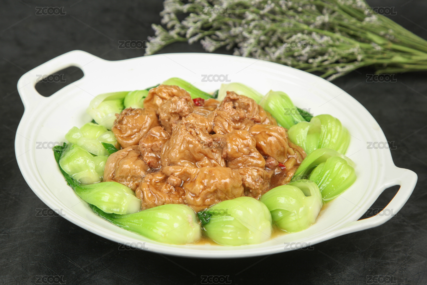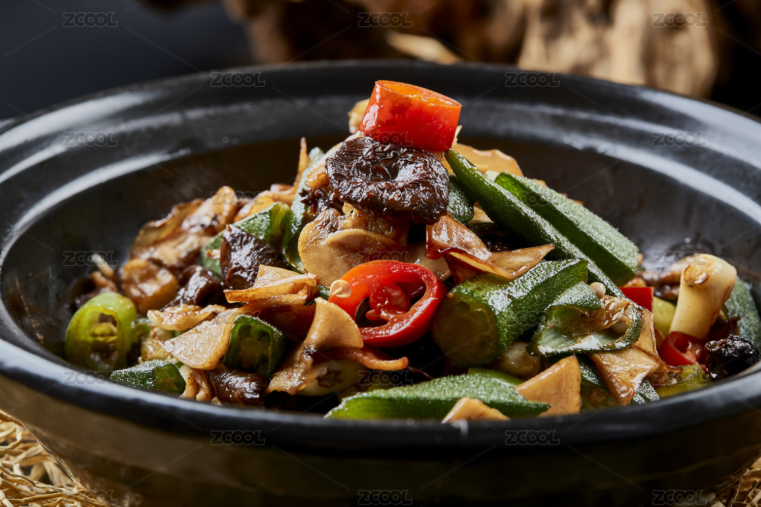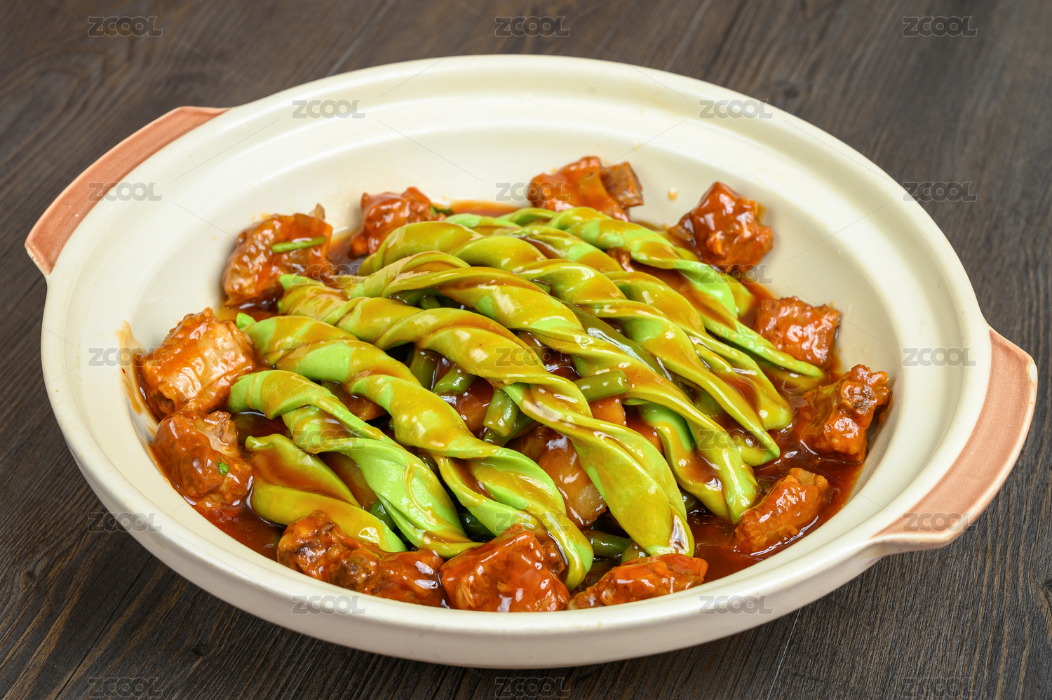 裙边椭圆白瓷盘装的五花肉小炒秋葵
