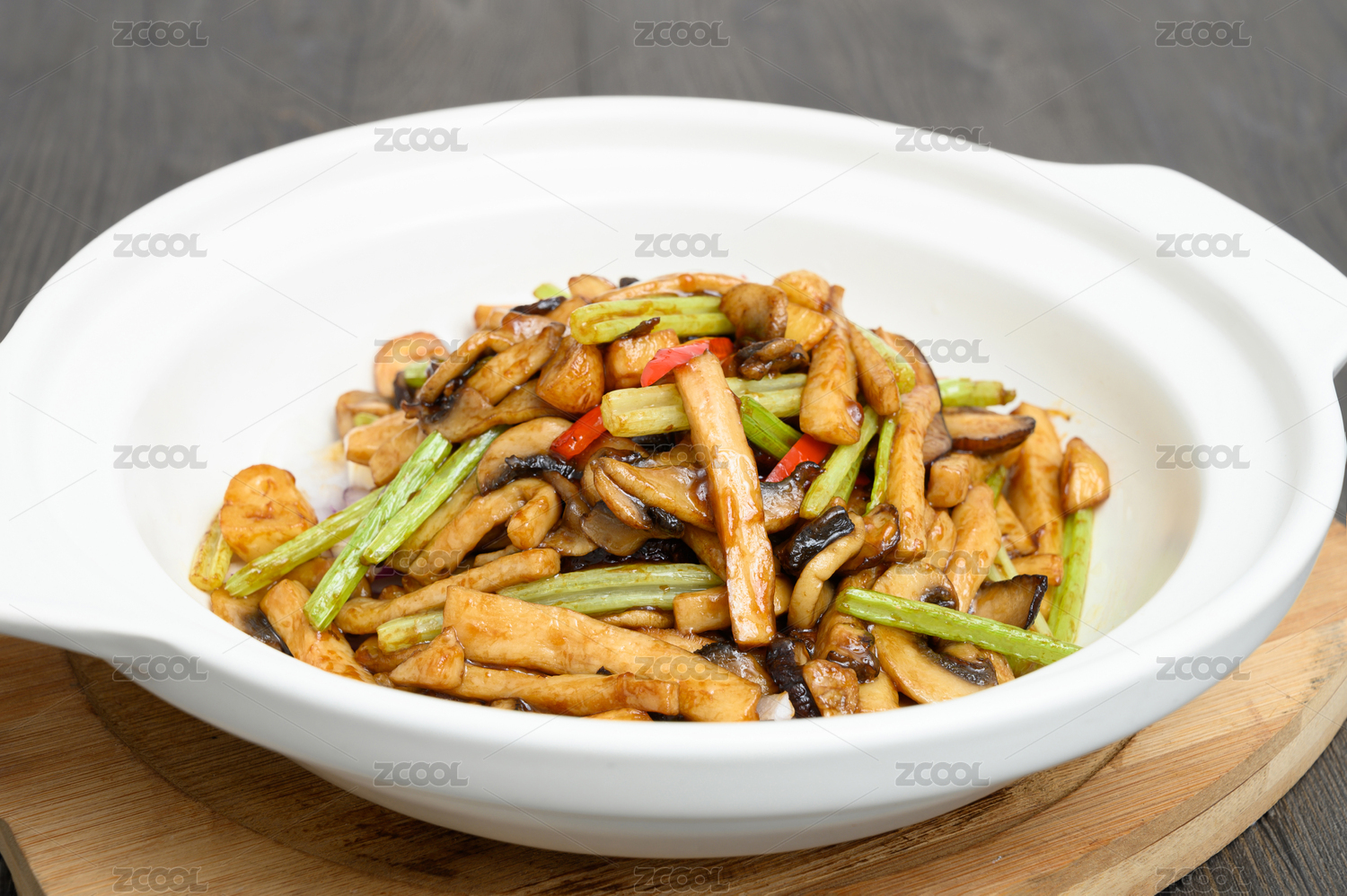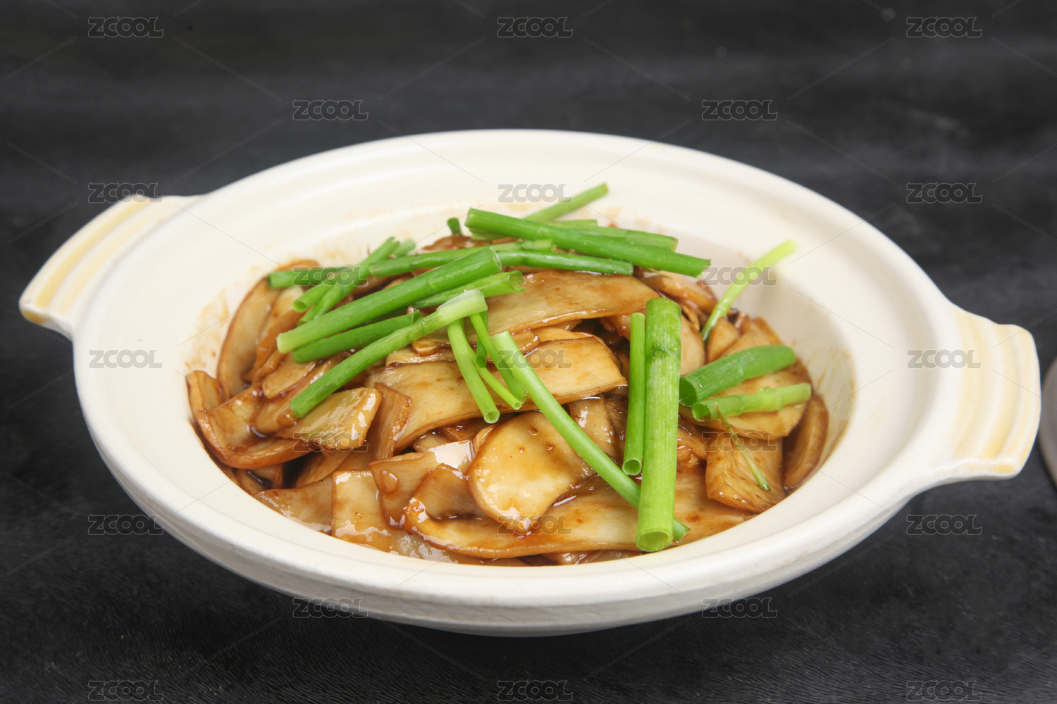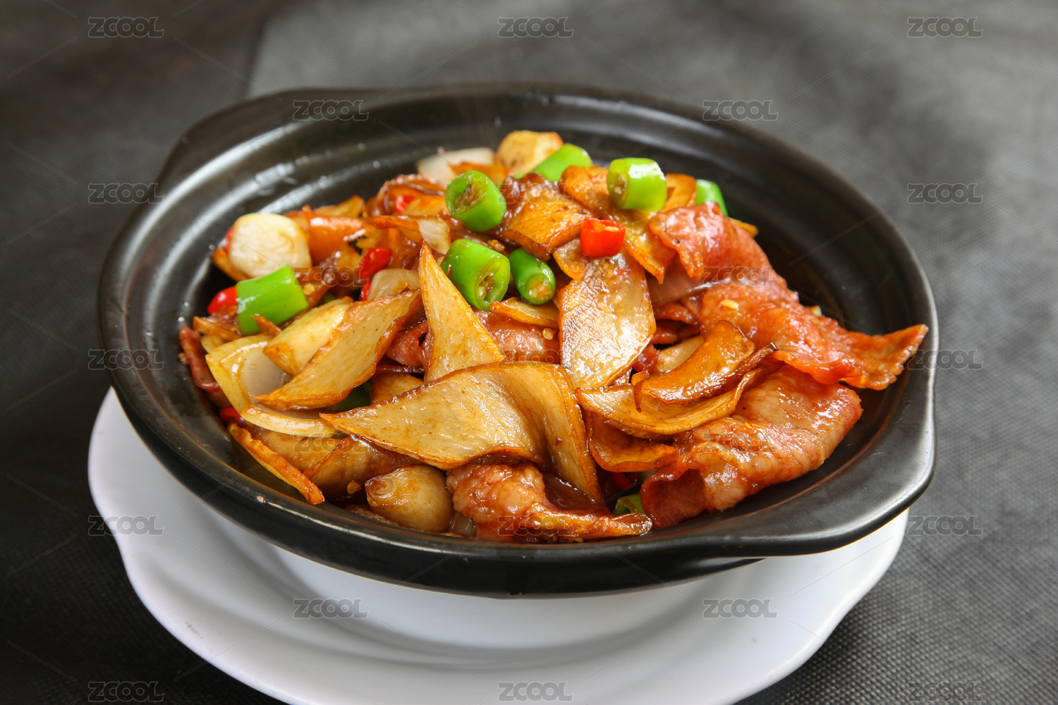 裙边椭圆白瓷盘装的五花肉小炒秋葵