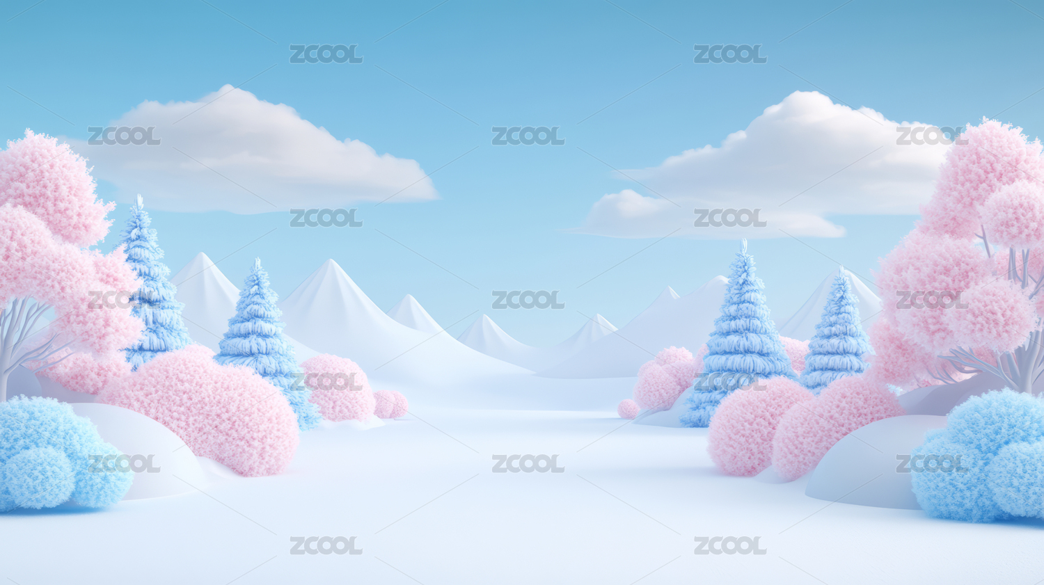 粉色蓝色树木与白色地形雪景三维卡通插画背
