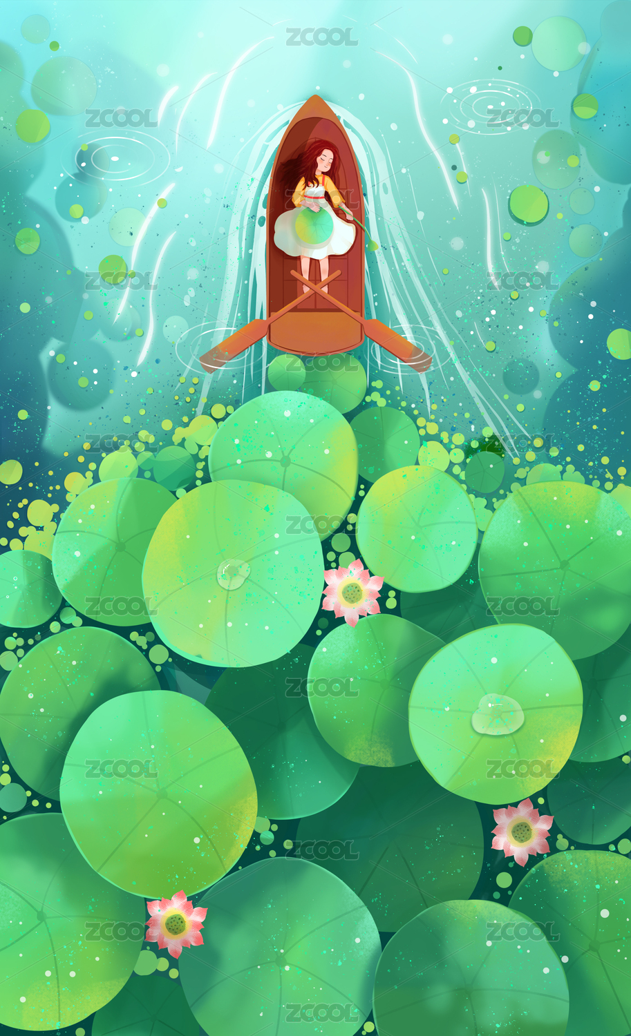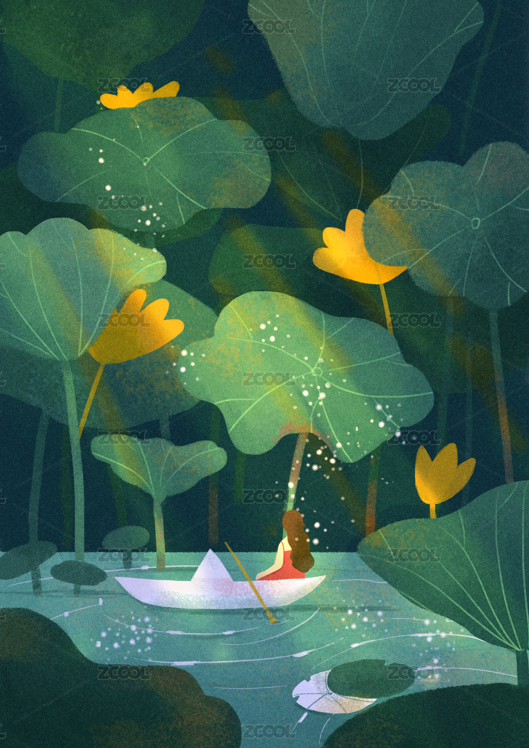 女孩在荷叶中泛舟,夏季节气插画