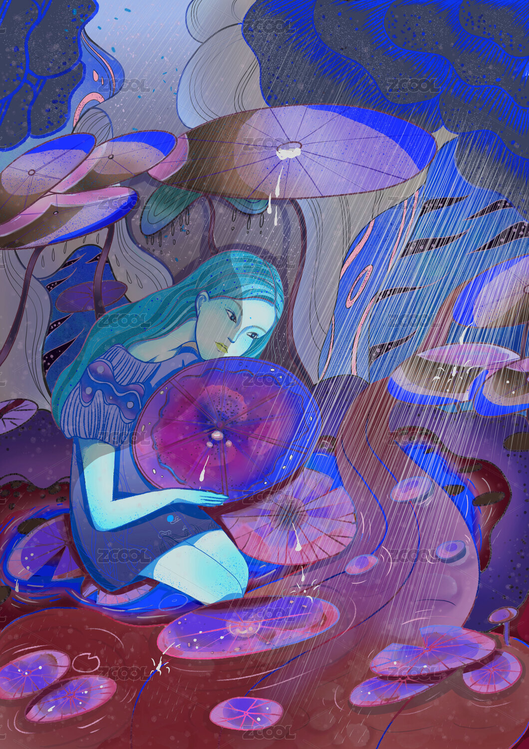 一个女生做在荷叶上的唯美插画